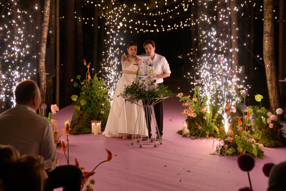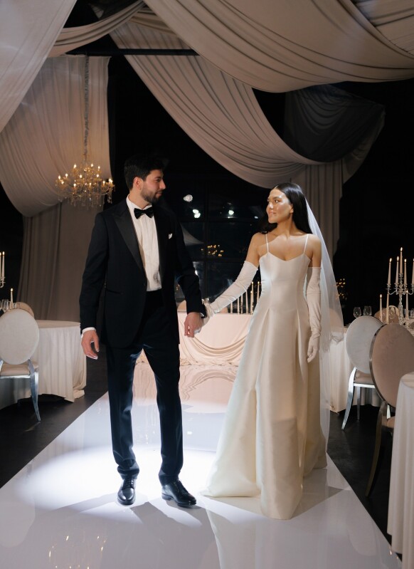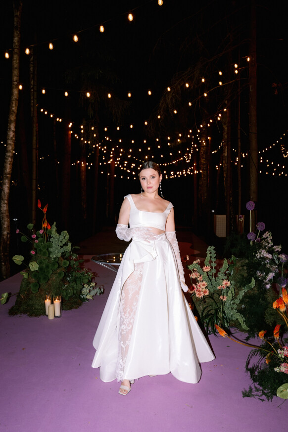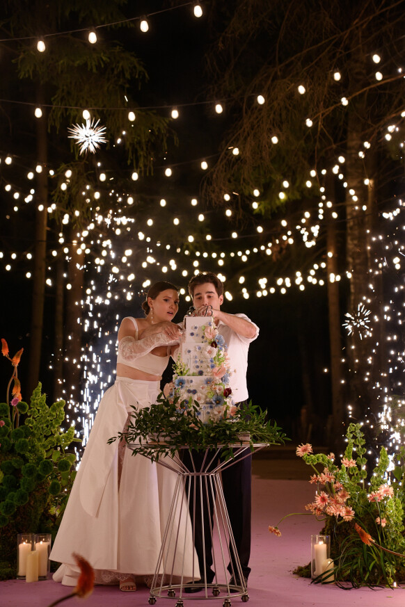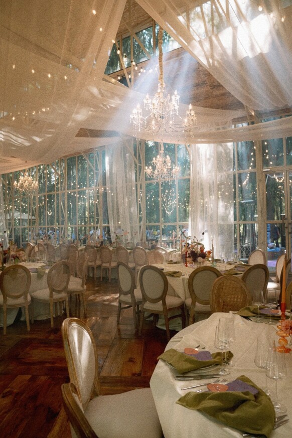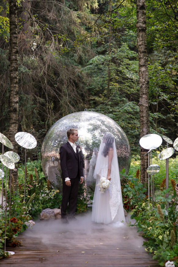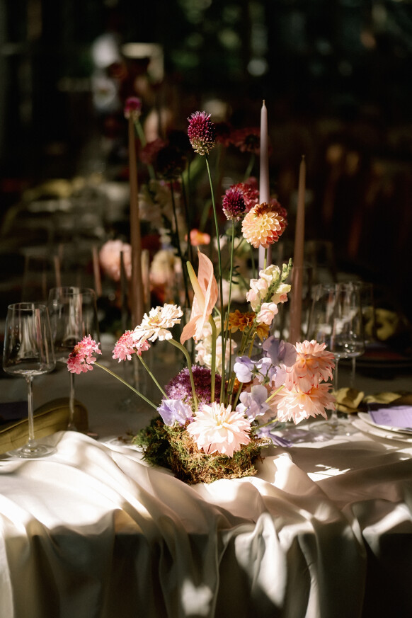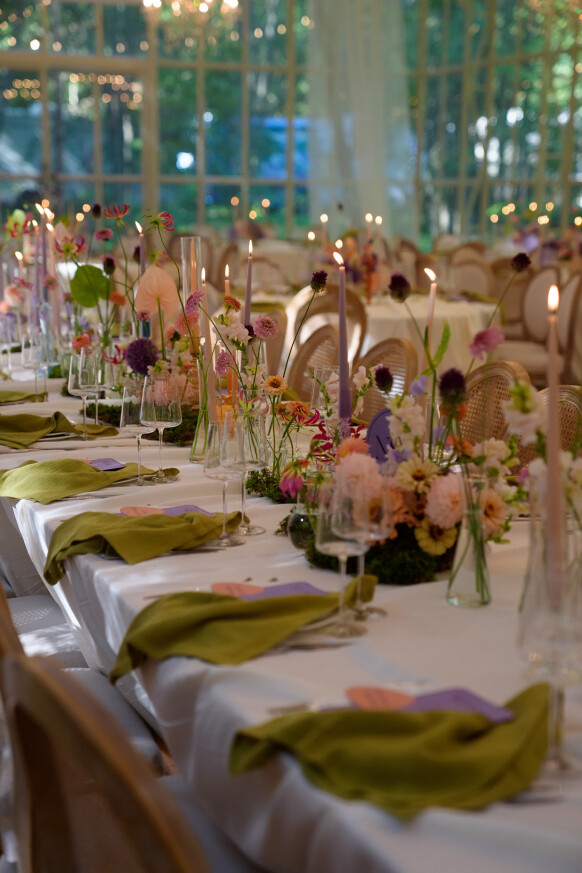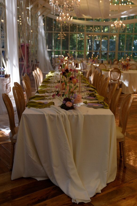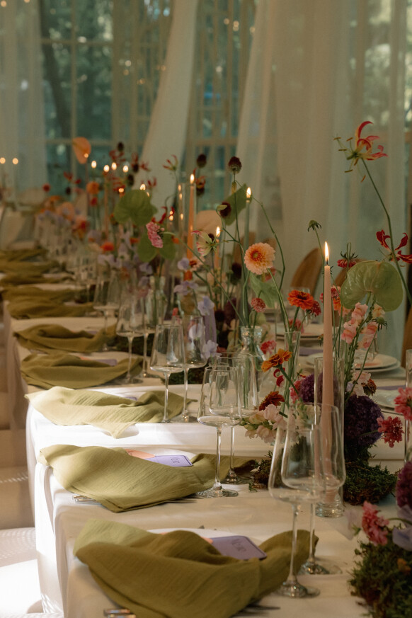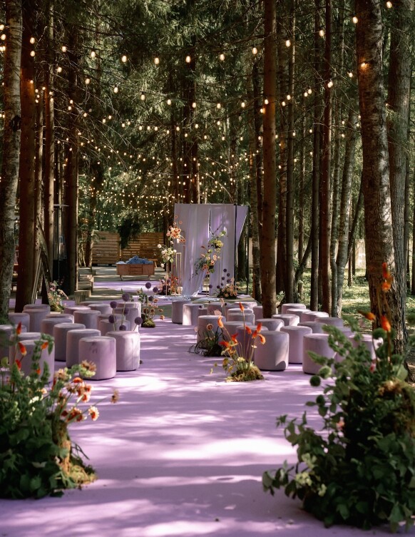Яркая, летняя, легкая и свежая, как и сами ребята. Ника мечтала о свадьбе в лесу, но с яркой и летней атмосферой. Цвет был везде - во флористике, в стекле подсвечников, в свечах, но тем временем за счет мха и драпировок хотелось сохранить магию леса.