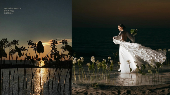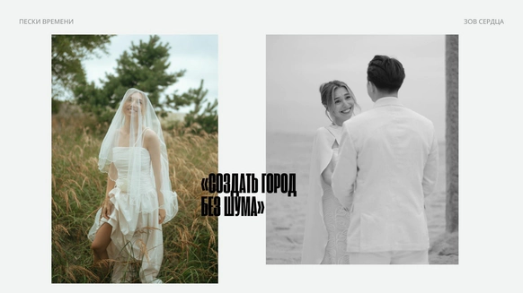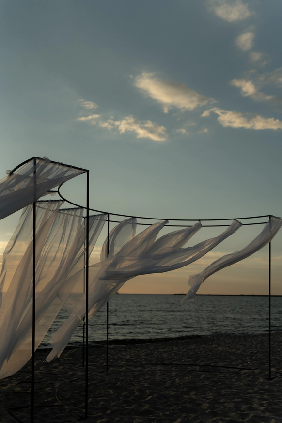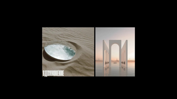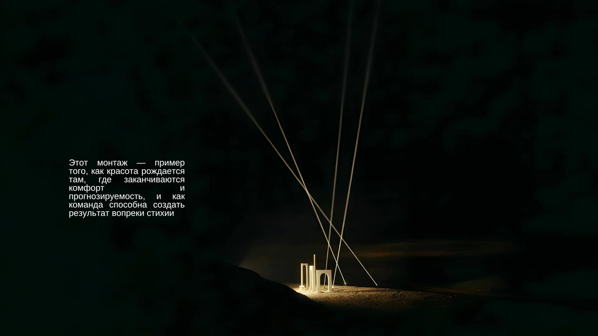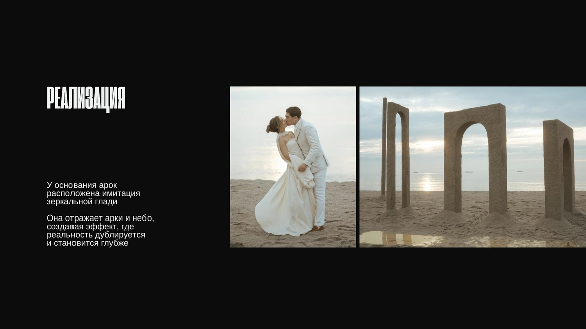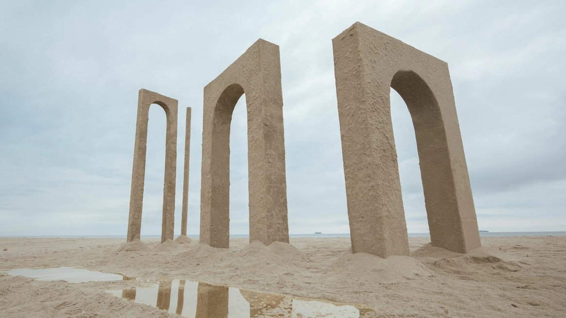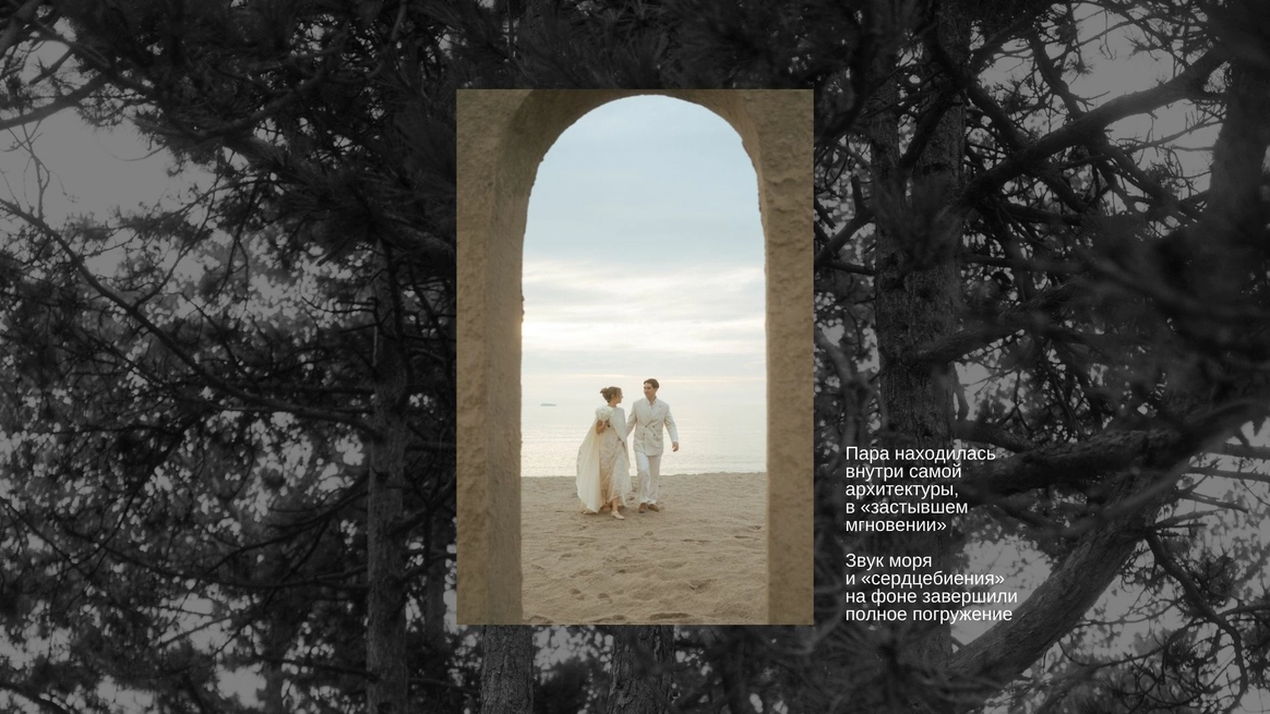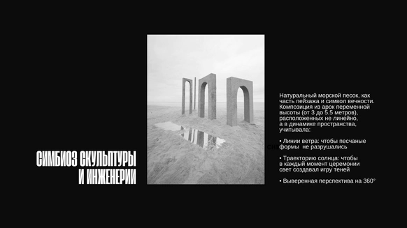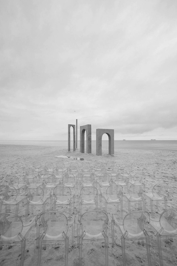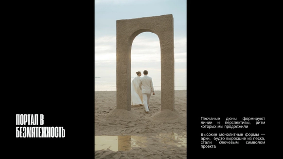 Балтийское побережье стало пространством, в котором родилась концепция — хрупкая и монументальная одновременно. Мы выстроили на песке высоченные арки, словно выросшие из самой земли. Их фактура — шероховатая, живая — напоминает о том, что время способно стирать и создавать. Эти арки, выстроенные в глубину горизонта, стали порталом в город без шума, где прошлое, настоящее и будущее соединяются