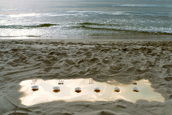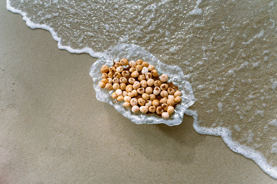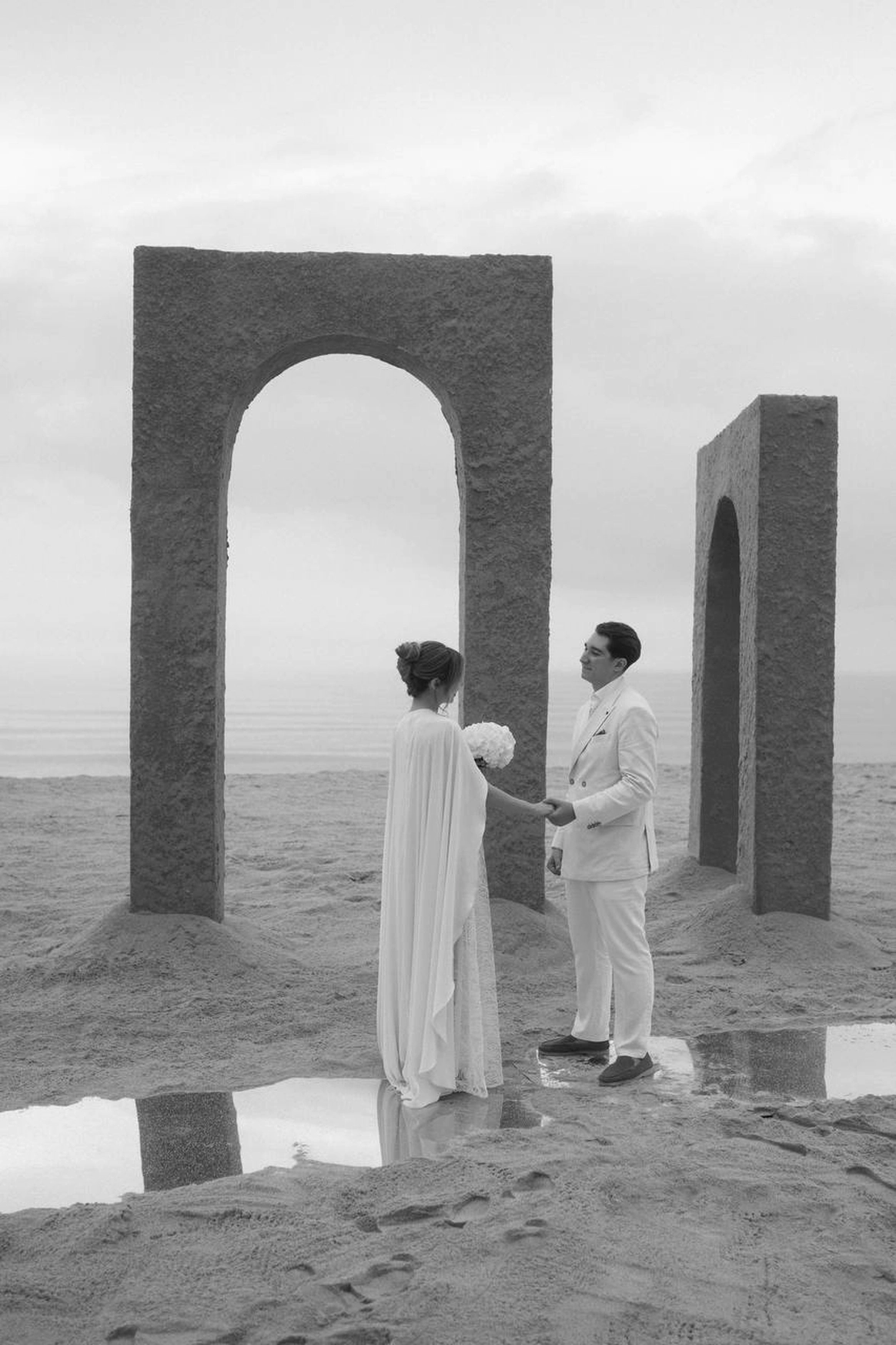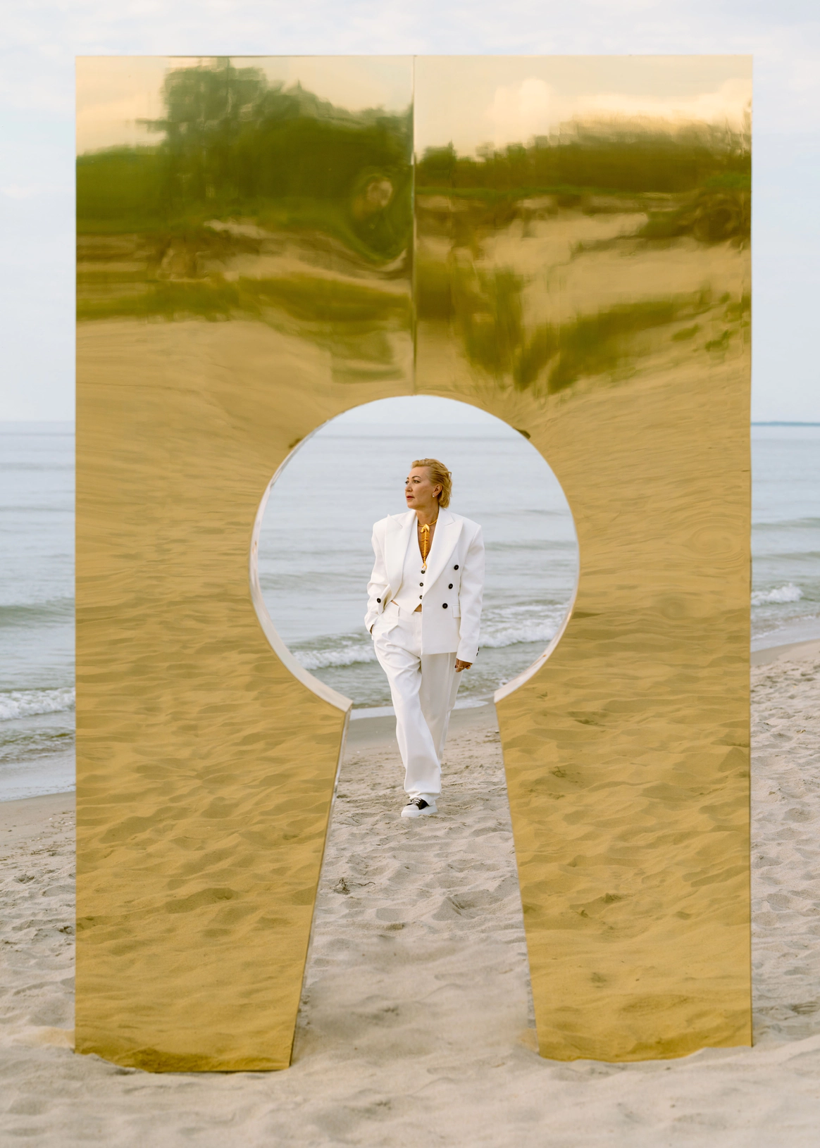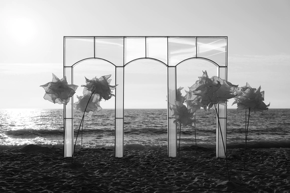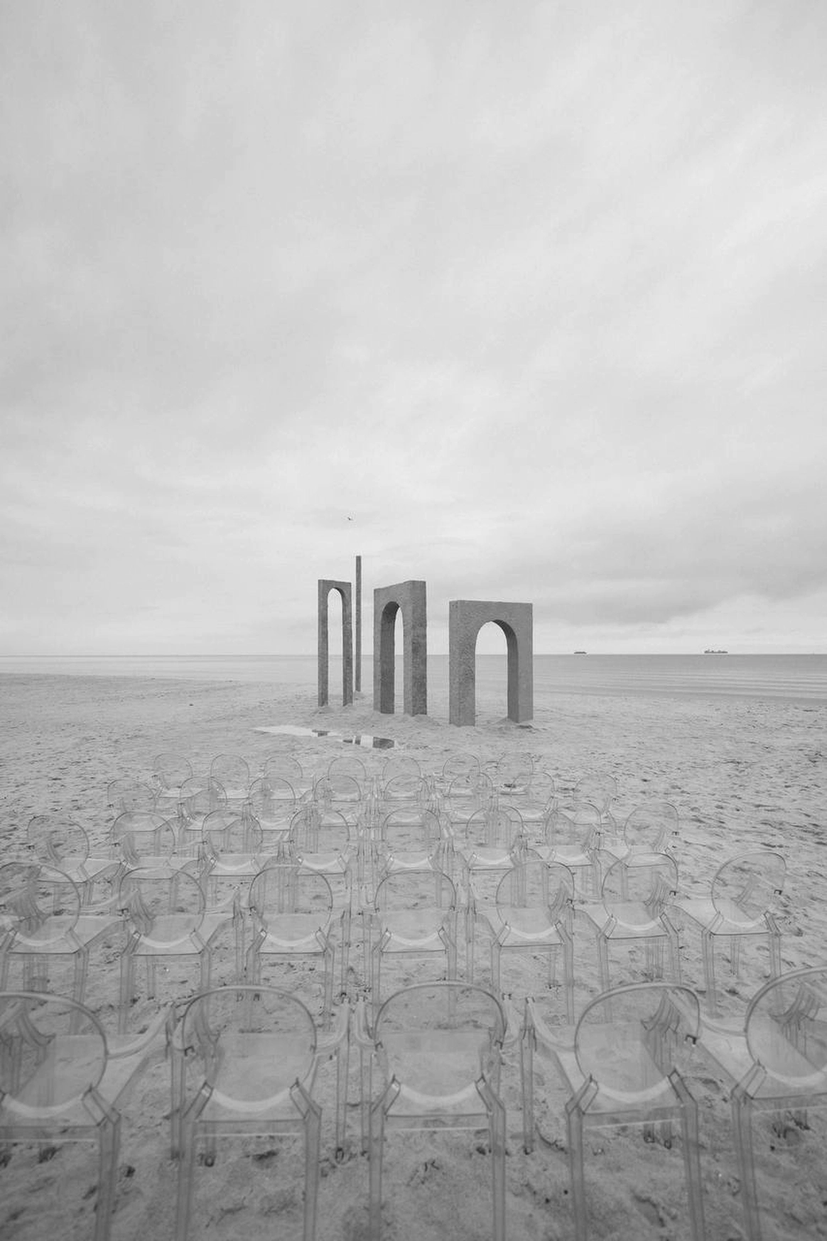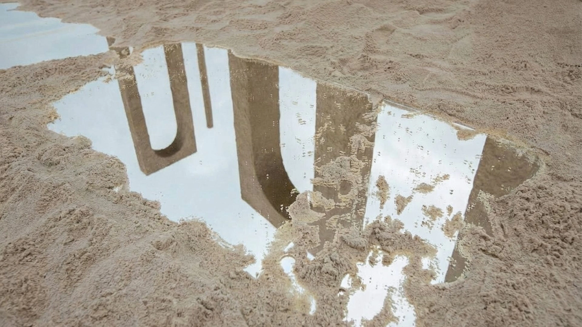Балтийское побережье стало пространством, в котором родилась концепция — хрупкая и монументальная одновременно. Мы выстроили на песке высоченные арки, словно выросшие из самой земли. Их фактура — шероховатая, живая — напоминает о том, что время способно стирать и создавать. Эти арки, выстроенные в глубину горизонта, стали порталом в город без шума, где прошлое, настоящее и будущее соединяются
