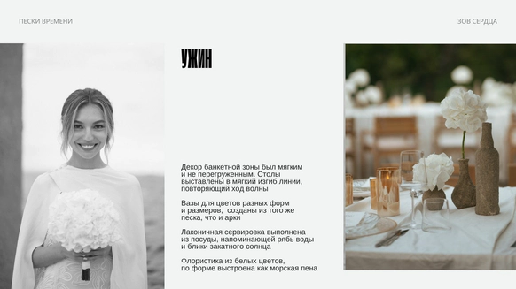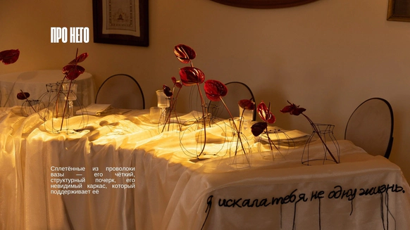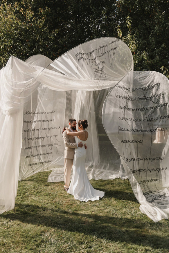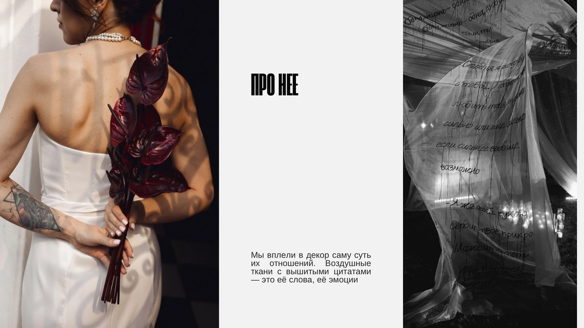 Свадебный проект «Скрипт» раскрывает идею любви как истории, написанной двумя разными, но дополняющими друг друга людьми. Она — психолог, чья душа подобна летящей ткани: эмоциональная, глубокая, воздушная. Он — структурный и педантичный, чей мир ясен и выверен, как карандашный набросок. Их союз становится соединением чувств и логики, интуиции и точности. В этой концепции любовь воспринимается как текст, где каждая встреча, мысль и выбор превращаются в еще одну строку.