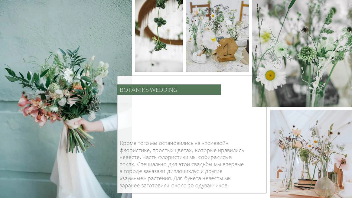 В штате команда дипломированных флористов (Nicole Москва) и профессиональных декораторов. Опыт работы на камерных свадьбах и масштабных площадках. Имеется своя школа, рестарт которой планируется в 2020 году. Пройденные тренинги и обучения: Total soul, БИТ, Event business conference - на постоянной основе. МК Юлии Шакировой, МК Лидии Симоновой, МК Александра Тулякова по витринистике Флористическая школа Nicole (2 года), Сибирская орхидея, Школа Ирины Молодцевой, индивидуальное обучение у Милы Шуман Pop upgrade MFS онлайн и оффлайн (бизнес курс по флористике) Семинары по продажам и личностному росту (Асеев, Хакамада, Меликситян)