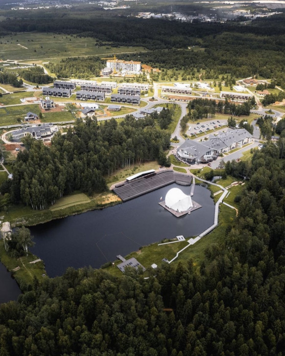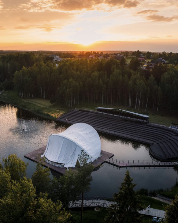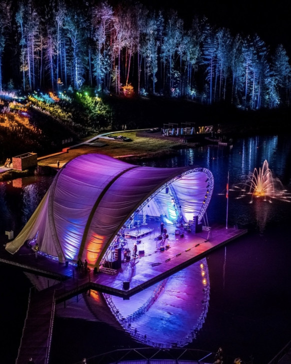 Понтонная сцена на воде подойдет для церемонии с большим количеством гостей. На берегу озера оснащен партер, откуда зрители могут наблюдать за происходящим.
