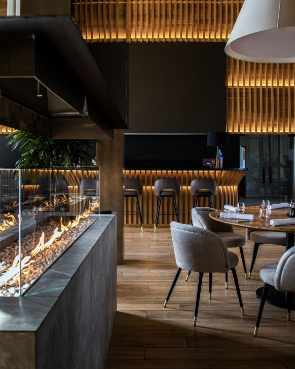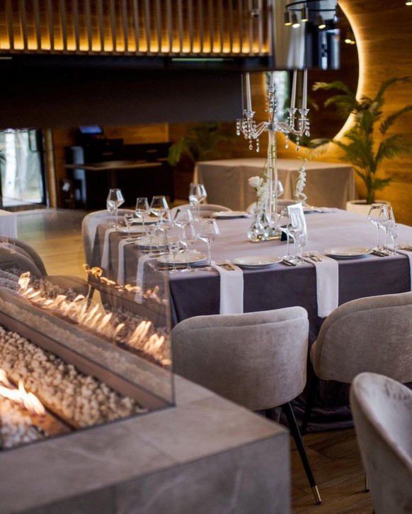 Минималистичный интерьер с панорамными окнами и видом на лесной пейзаж сочетаются с высокой авторской кухней. Ресторан станет идеальным решением для выездной регистрации, welcome-зоны и камерного ужина.