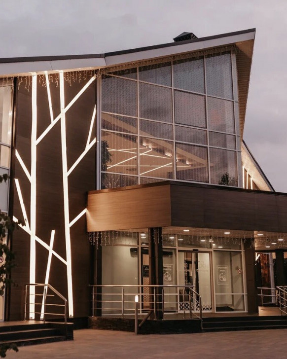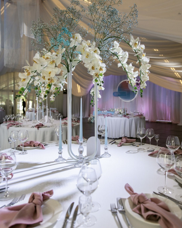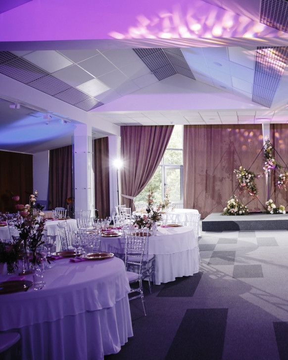 Еще один вариант для масштабного торжества находится на втором этаже парк-отеля «Доброград». Благодаря панорамным окнам, в зале много света, а большая площадь, видеостена и звуковое оборудование позволяют декораторам и флористам реализовать в пространстве любую фантазию.