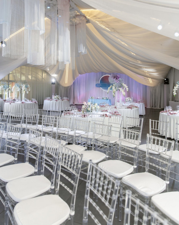 Шатровый ресторан с панорамными окнами станет отличным вариантом для масштабной свадьбы. На площади в 400 квадратных метров можно воплотить в жизнь любую задумку. Из основных преимуществ площадки: техническое оснащение, отдельная зона для welcome, бар и сцена.