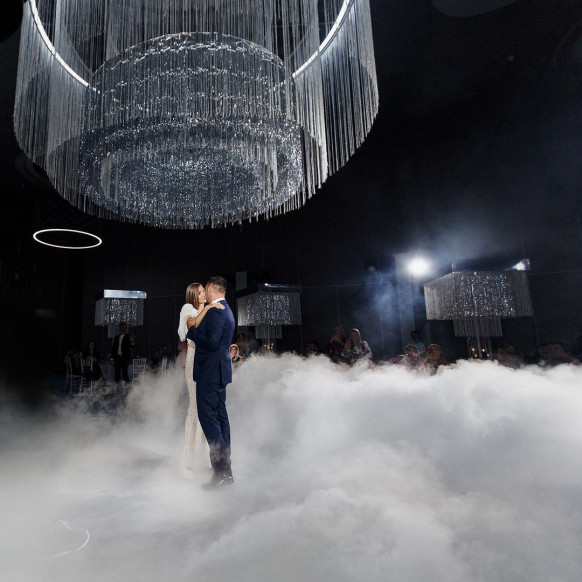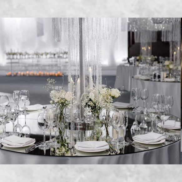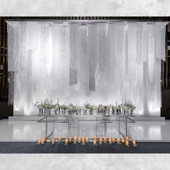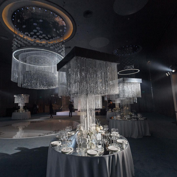 Вписать серый цвет в концепцию мероприятия органично удалось команде самой большой студии декора в Крыму NeboDekor. В качестве центральной композиции в оформлении банкетного зала свадьбы в отеле Mriya Resort & Spa декораторы выбрали люстру из серебристых нитей. Серый цвет текстиля и стен вместе с белоснежной флористикой смотрелся элегантно и сдержанно.