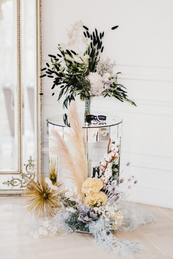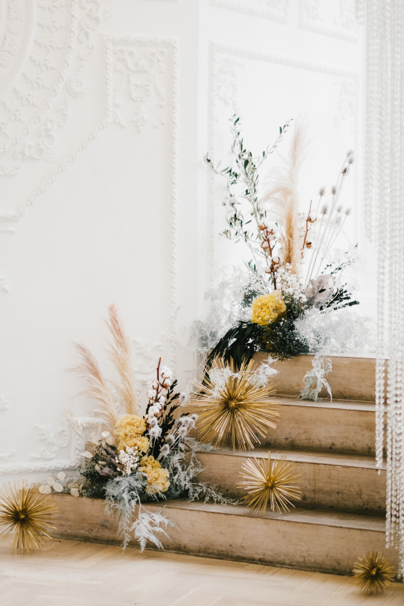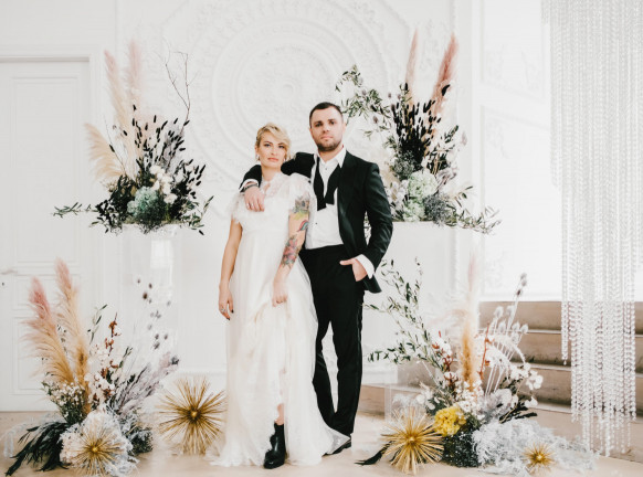 Сочетать эти два цвета тоже можно. Доказательством служит декор на фотосессии фронтмена группы «Градусы» вместе с женой. Оформлением площадки занималась Екатерина Джулия, руководитель и основатель московской студии декора Katrin Bureau. Декоратор выбрала сухоцветы серых, бежевых и даже черных оттенков, и разбавила их вкраплениями желтых цветов.