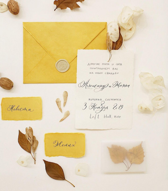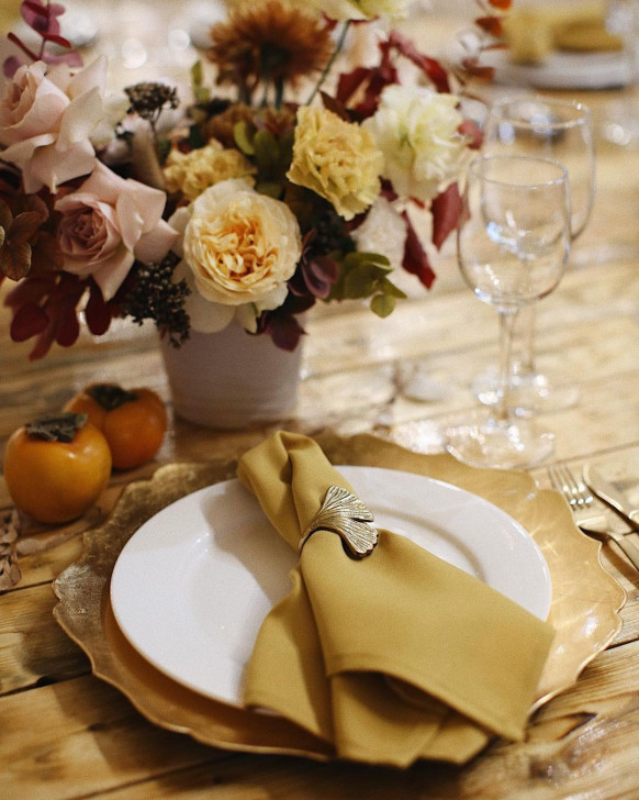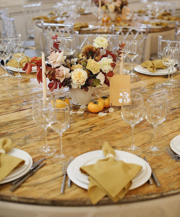 Оформление осенней свадьбы от студии Lollipops decor — пример того, что даже такой яркий цвет, как желтый, может выглядеть нежно и гармонично. Тут играет роль и приглушенность самого оттенка, и его сочетание с пастельными цветами, а также натуральным цветом светлого дерева. Мягкий желтый прекрасно дополняют природные осенние цвета листьев и сезонных фруктов — например, хурмы, которая тоже стала элементом декора.