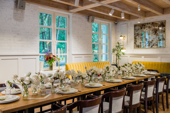 Уютный ресторан площадью 87 м. кв. с парадным холлом и ротондой станет прекрасным дополнением: тут также можно провести приветственный коктейль и организовать игровую зону для детей. Работает он и как самостоятельное пространство для торжества в кругу самых близких. К услугам гостей — наземная, бесплатная, охраняемая парковка на 30 машин.