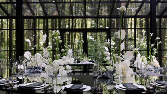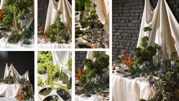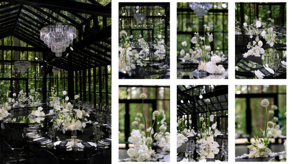 - флористика с интересным составом из белых цветов с камнями и белыми грибами, как отсылка к чему-то звездному и космическому