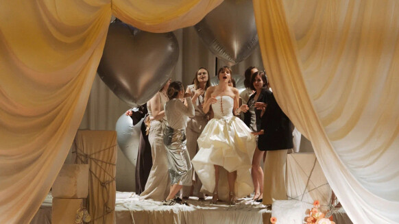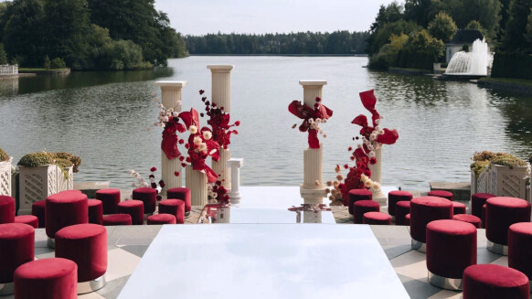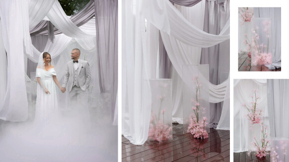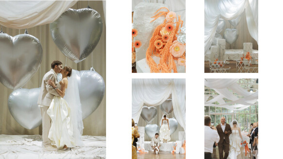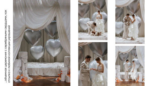 - многослойная зона церемонии с серебряными надувными сердцами, как отсылка к любимой коллекции украшений невесты от бренда Avgvst