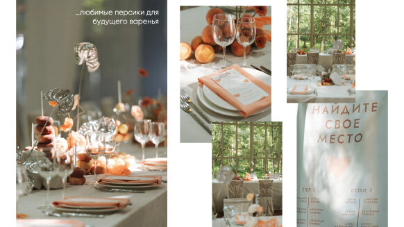 - персиковые герберы, бумажные маки, гладкие серебряные антуриумы и фактурный персиковый амарант с любимыми персиками пары, из которых после мероприятия было сделано персиковое варенье
