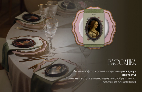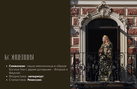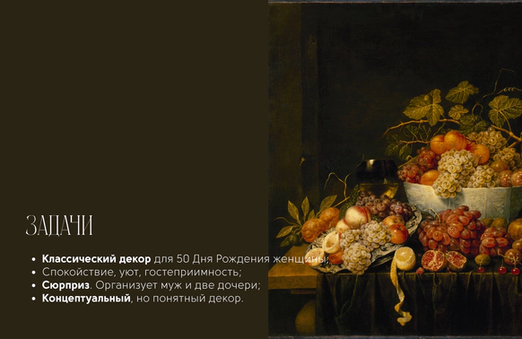 День Рождения-сюрприз, который создавали для именинницы две ее дочери и муж. Концептуальный подход организаторов- мы решили сделать историю про День Рождения богини Геи в окружении ее дочерей - Флоры и Фауны. Классический декор с идеей натюрморта. Рассадка гостей была портретами в образах картин Ренессанса, которые гости потом забрали с собой.
