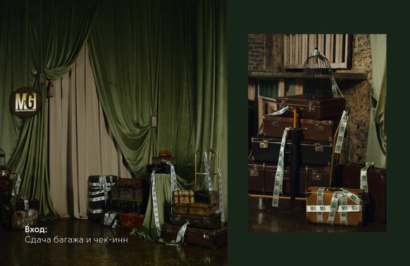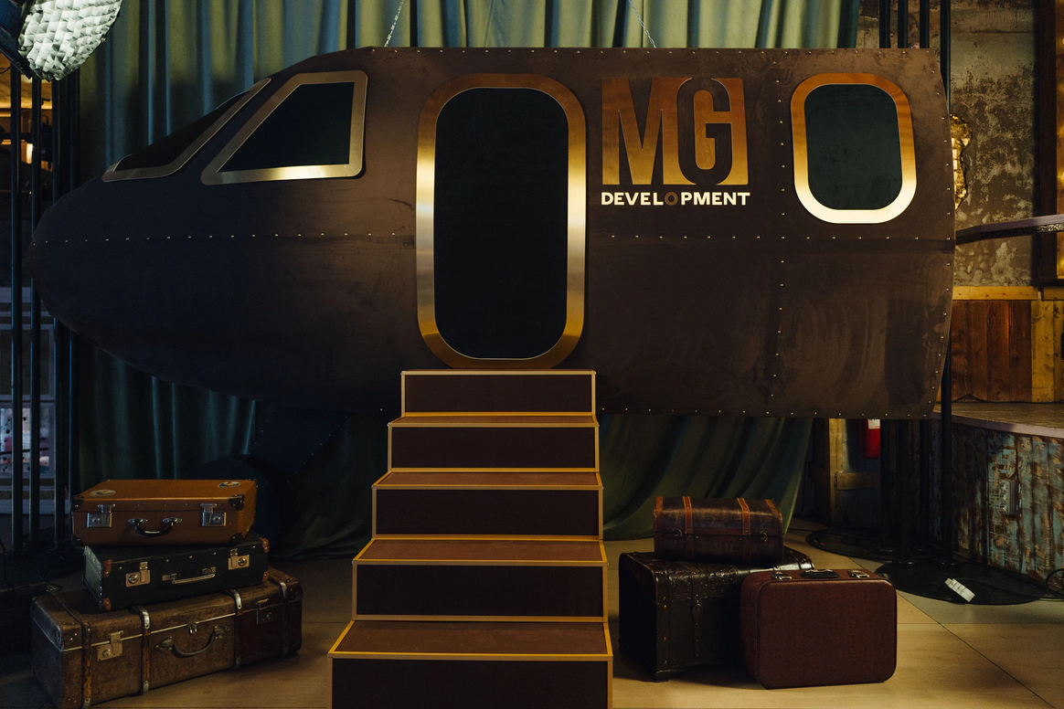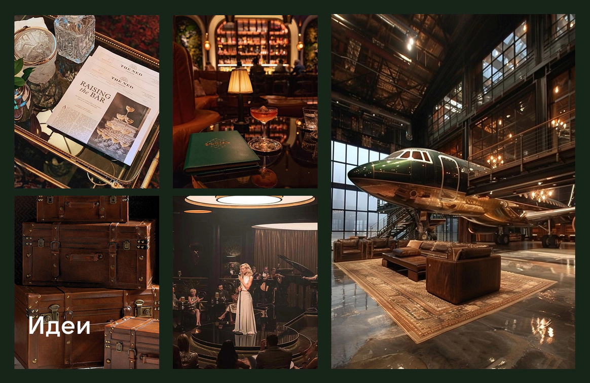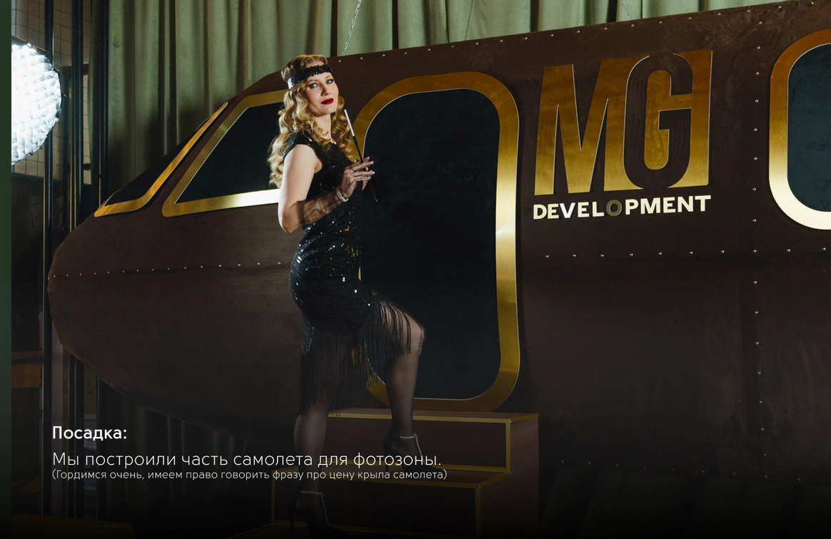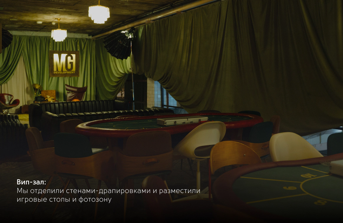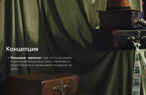 Проект несет наследие прошлого и логичность прохода гостей по всем зонам. Первые это сдача одежды в гардероб и чек-ина, дополненного фотозоной- сдача багажа. Далее проходы с обозначениями и большой зал-аэропорта для основной программы с экраном-информацией, затем проходы в вип-залы с игровыми столами и фотозоной.