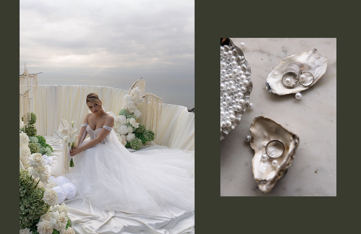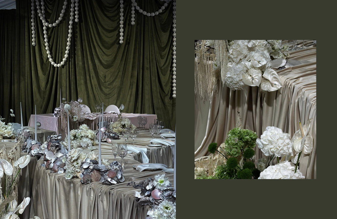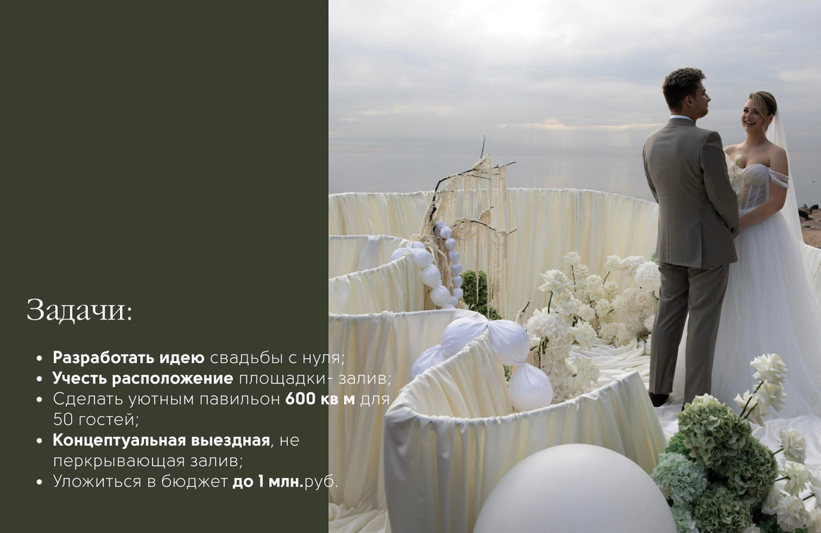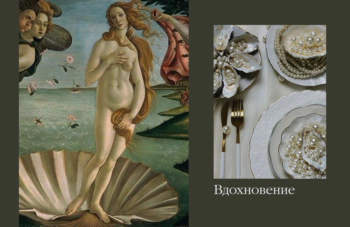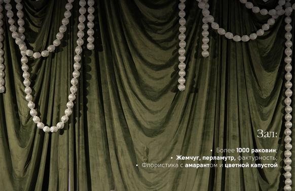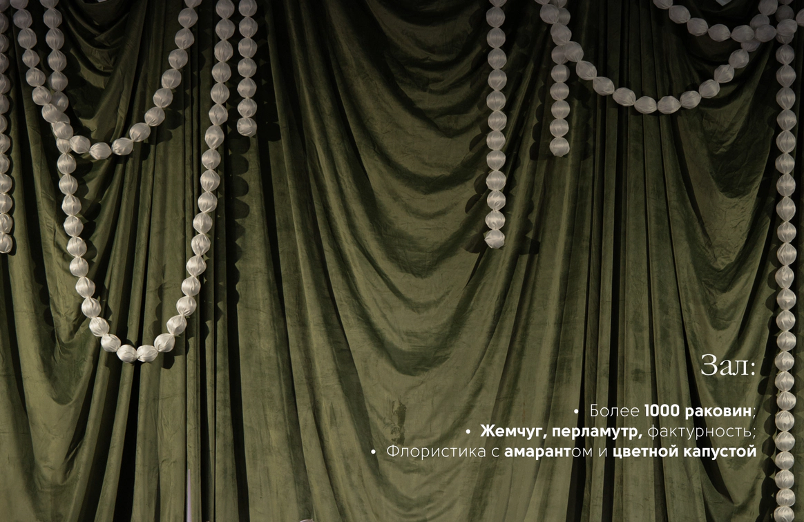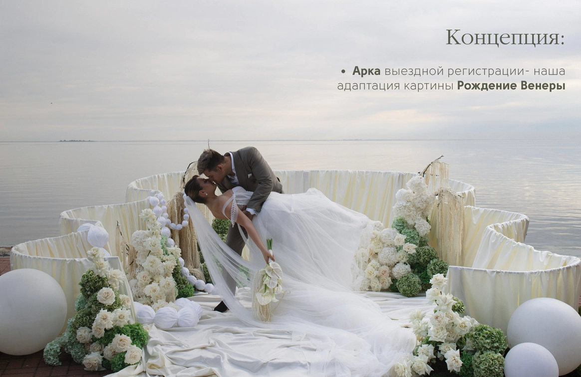 Свадьба на берегу залива с отсылкой к творчеству Ботичелли под романтичным названием "Рождение Венеры". Наша невеста хотела концептуальный проект, при этом иносказательный, который будет говорить с гостями загадками. Так родилась идея выездной регистрации- вольного прочтения картины Ботичелли, зал дополнил концепт- это ужин в подводном мире грез, где декором служили раковины, цветная капуста и амарант создавали иллюзию коралловых рифов. Антуриумы мы покрасили перламутровой краской для создания иллюзии раковин, а задник дополнили жемчугом.