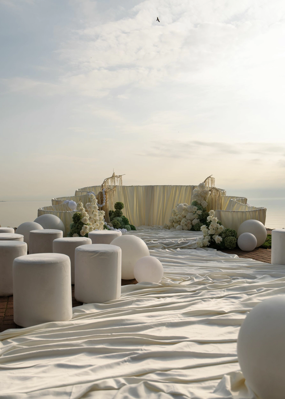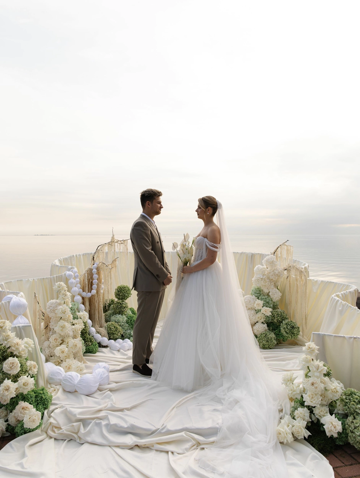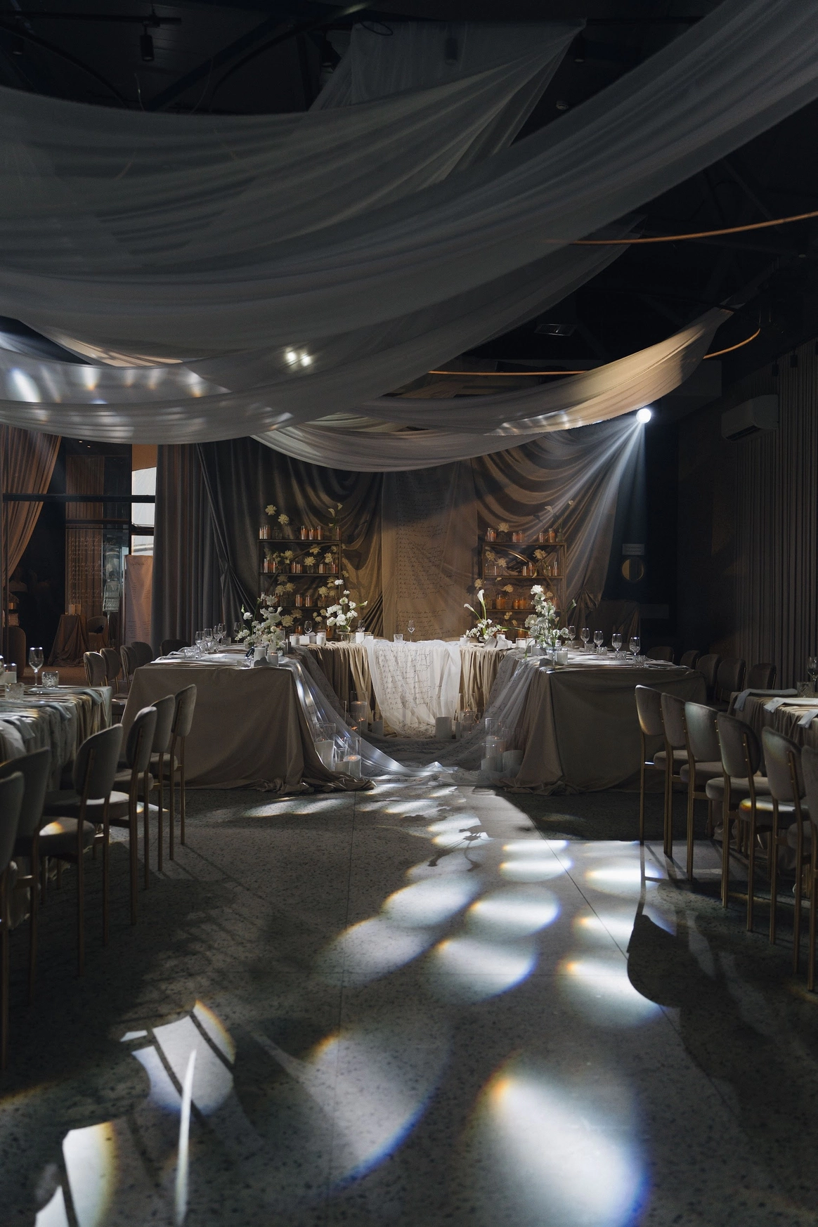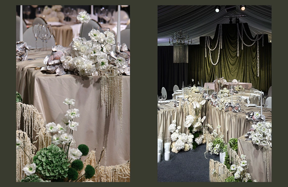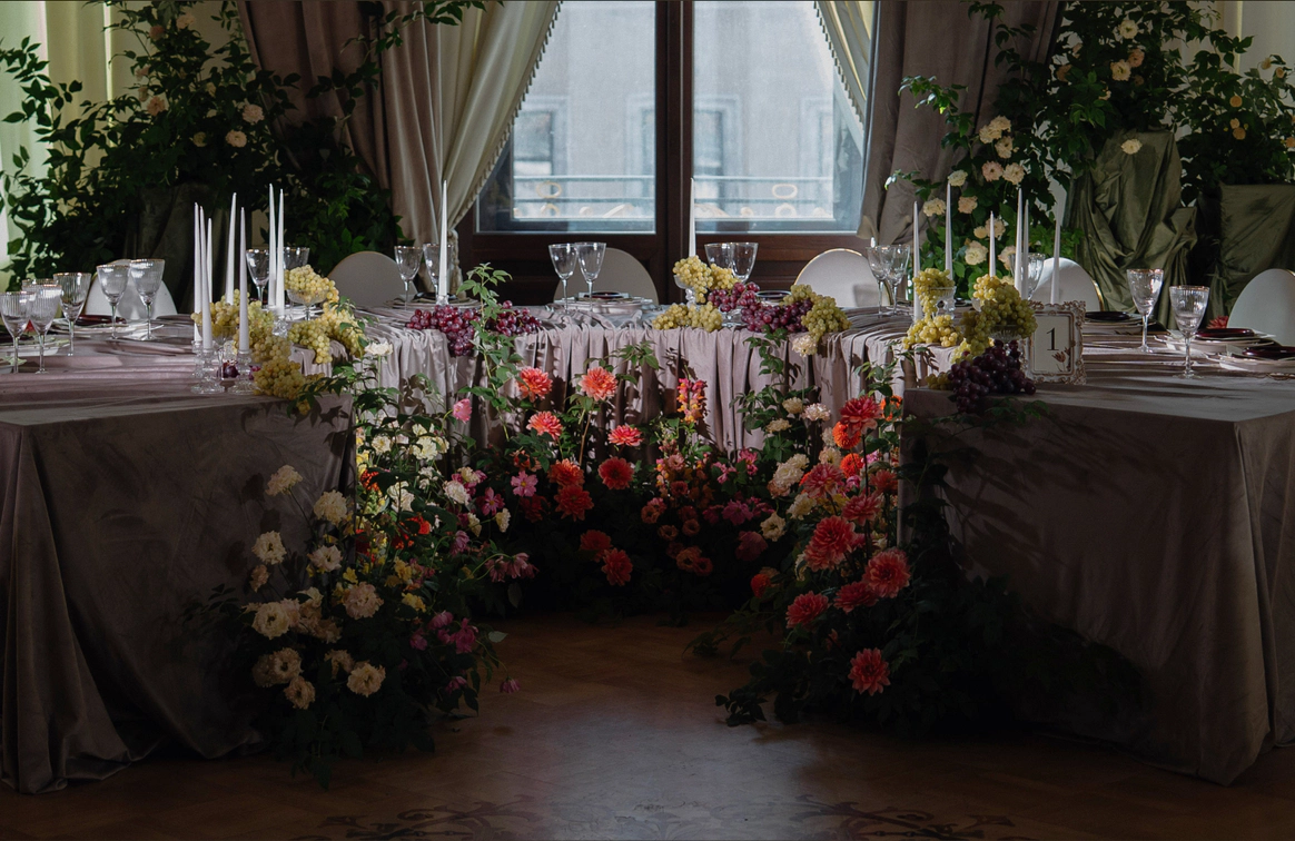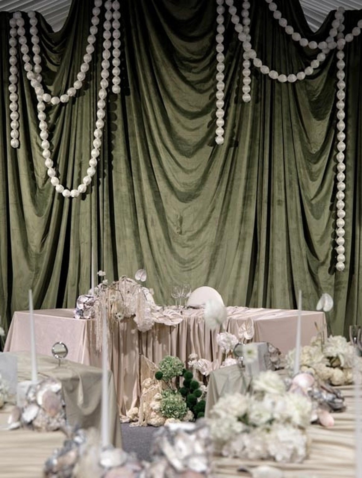 Свадьба на берегу залива с отсылкой к творчеству Ботичелли под романтичным названием "Рождение Венеры". Наша невеста хотела концептуальный проект, при этом иносказательный, который будет говорить с гостями загадками. Так родилась идея выездной регистрации- вольного прочтения картины Ботичелли, зал дополнил концепт- это ужин в подводном мире грез, где декором служили раковины, цветная капуста и амарант создавали иллюзию коралловых рифов. Антуриумы мы покрасили перламутровой краской для создания иллюзии раковин, а задник дополнили жемчугом.