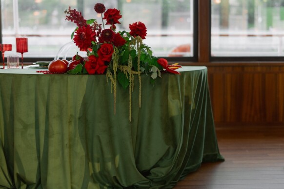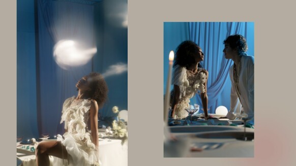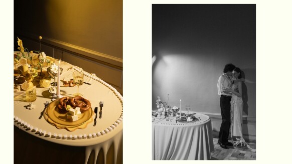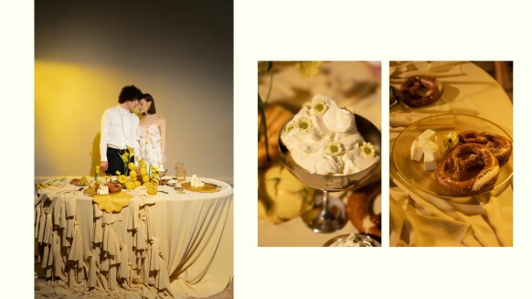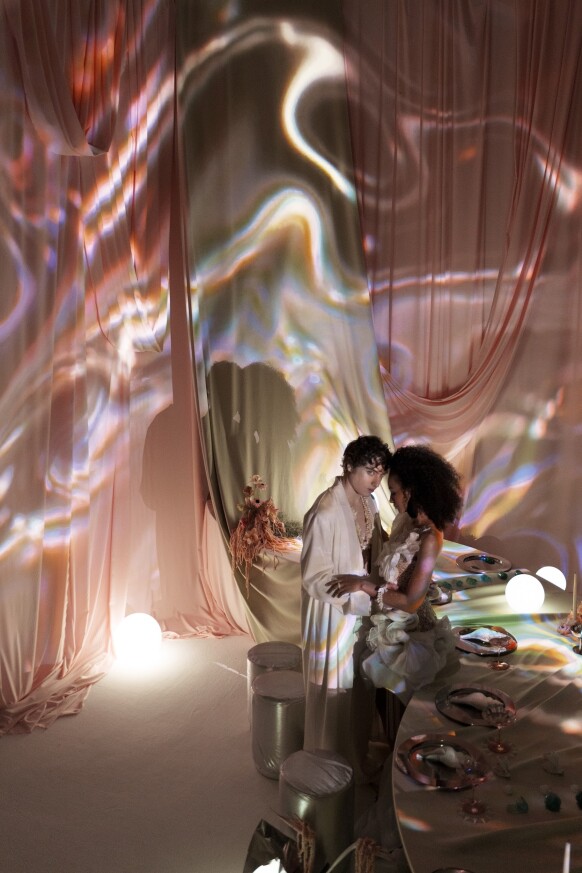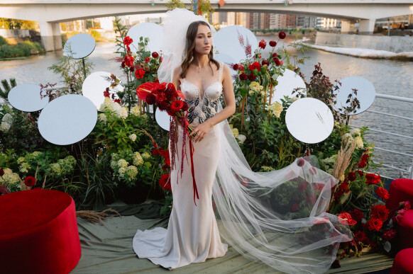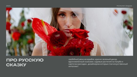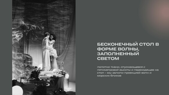 Наша пара - современные герои, воспитанные на романах о дальних странствиях и на современном искусстве с полной свободой проявлений, и поэтому день, когда они говорят друг другу да - сцена из подводного мира, алтарь - стол, уходящий в небо, а первый танец - с современным балетом - русалками
