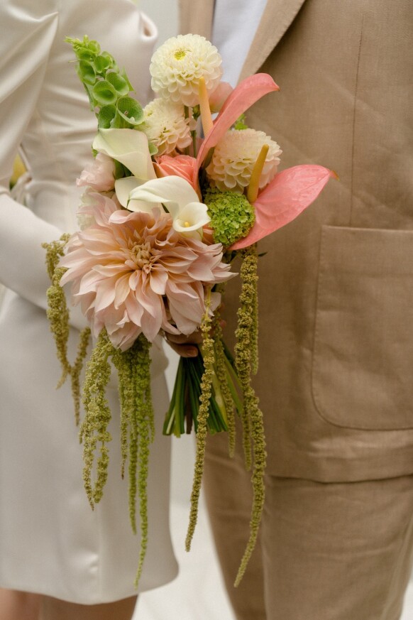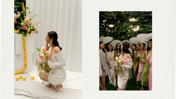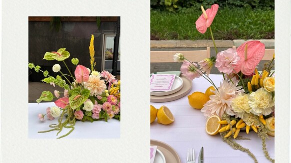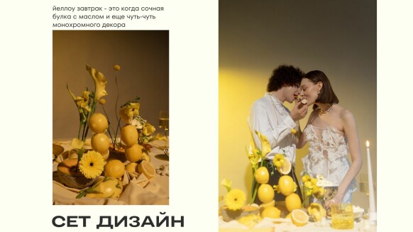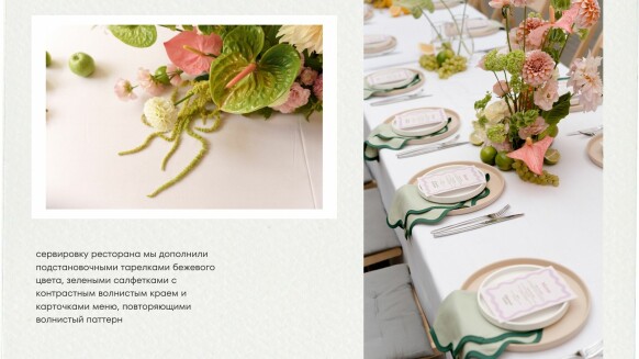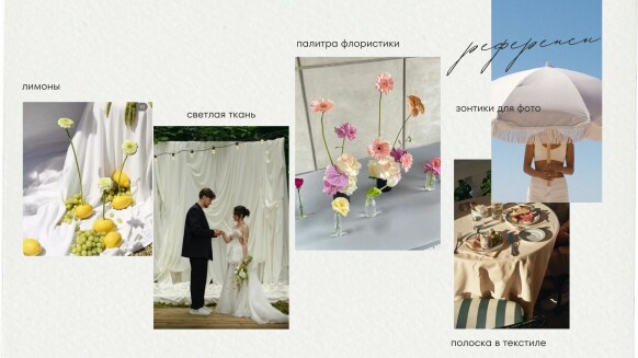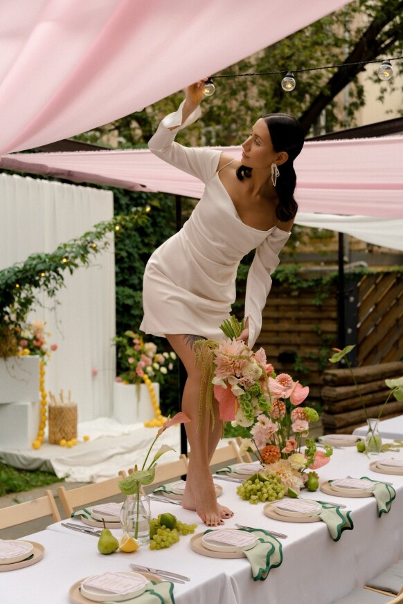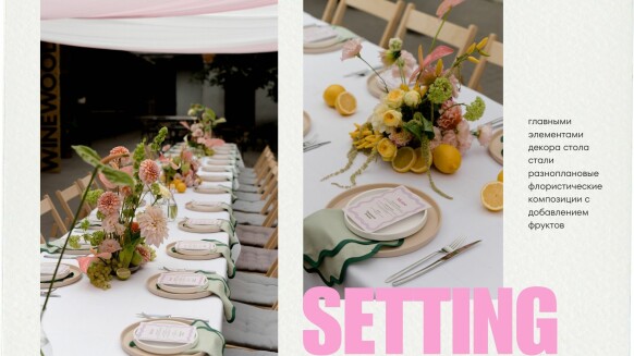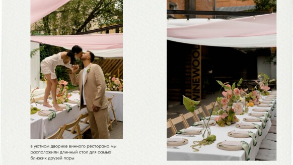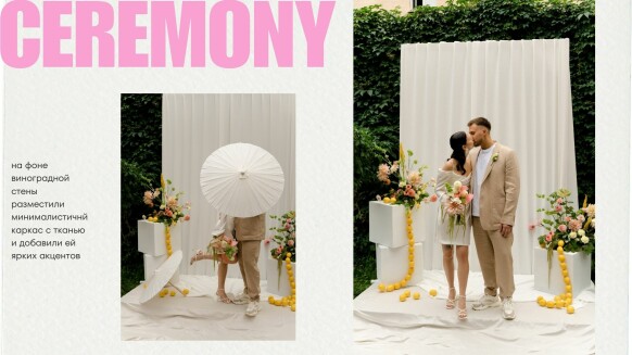 Нежная палитра розовых, лимонных и зеленых оттенков, волнистые линии, легкие ткани и бумажные зонтики для фото, виноград и лимоны в декоре, и все это в атмосфере уютного московского дворика