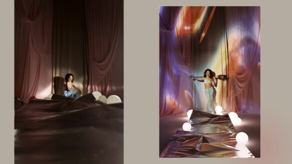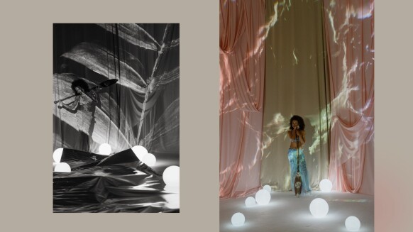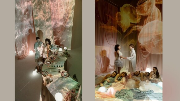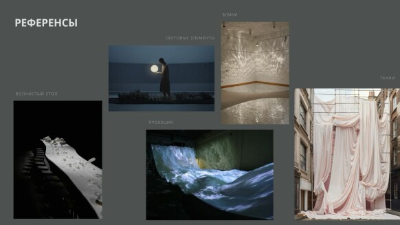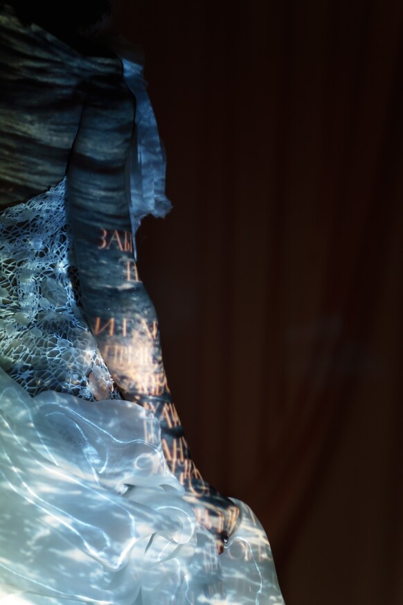 Пятиметровые вертикали тканевых полотен переходили на поверхность волнистого стола, становясь полотном для мэпинга.