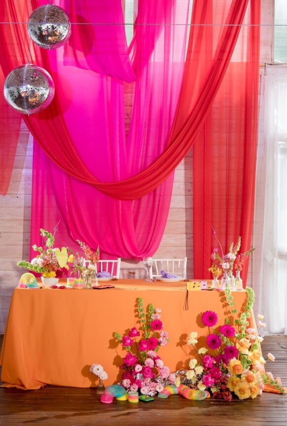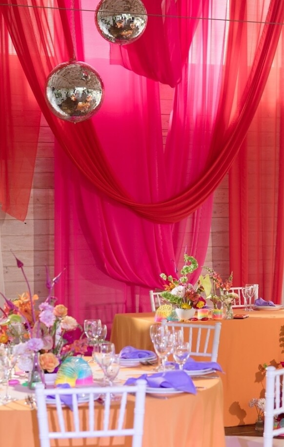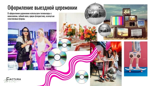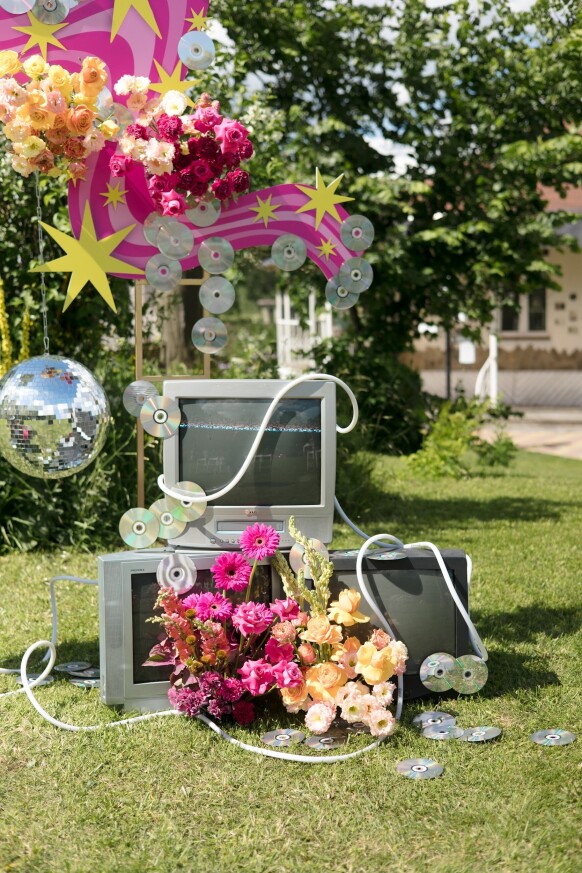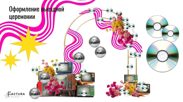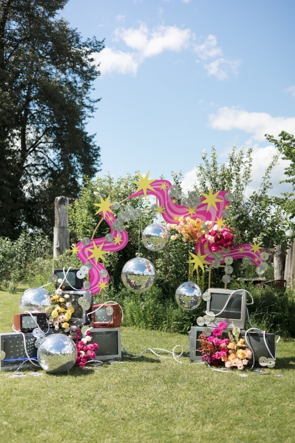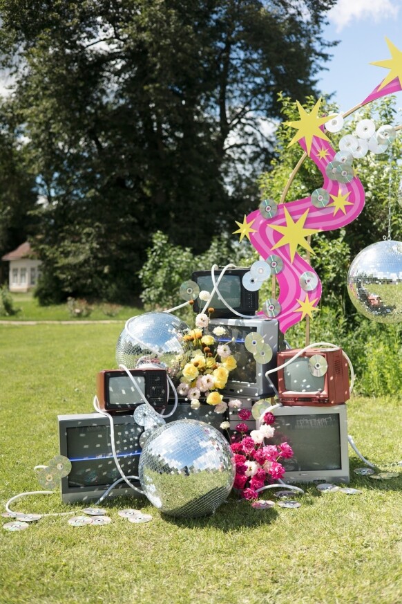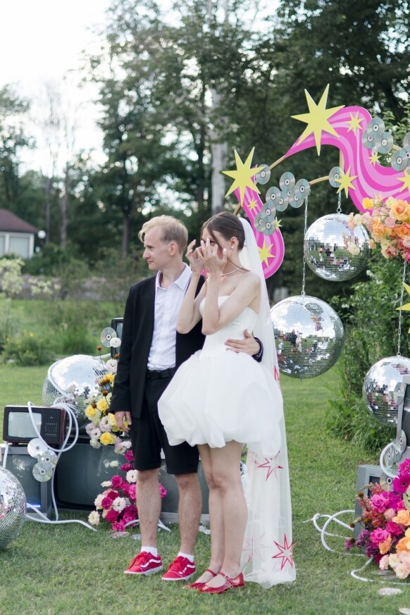 А в центре церемонии — работающие телевизоры, яркий пластик с культовыми семиконечными звёздами (как на фате невесты), компакт-диски, диско-шары и гибкий неон. Мерцающий, смелый, дерзкий дизайн, который не просто оформил праздник, а превратил его в портал в любимое десятилетие!