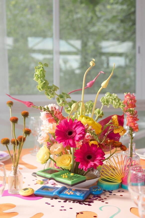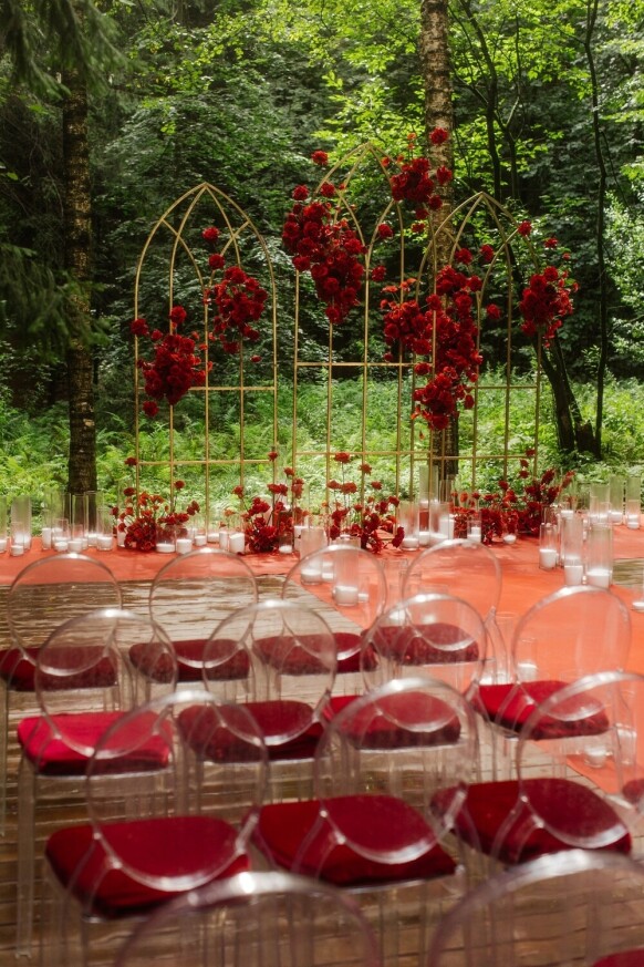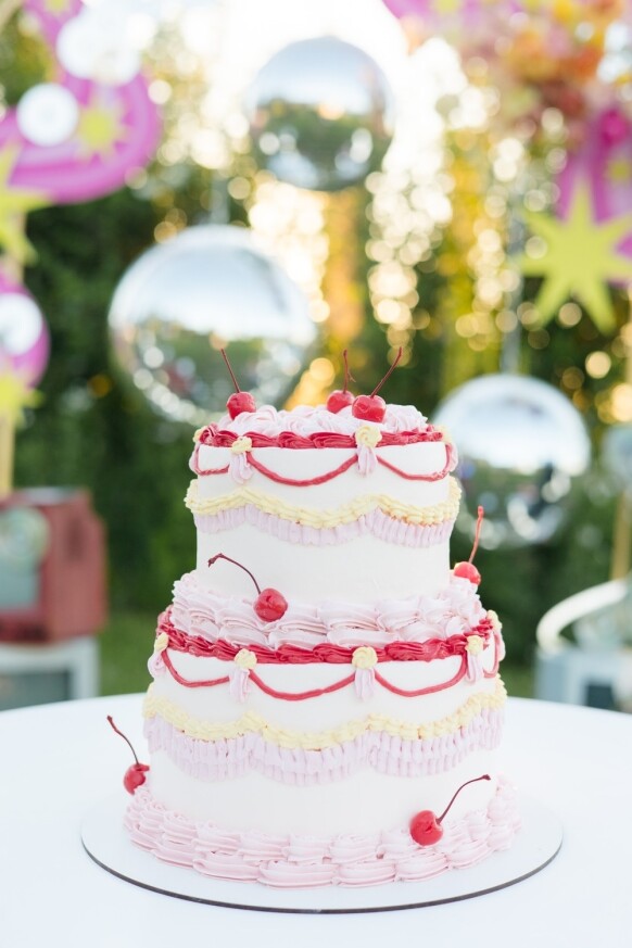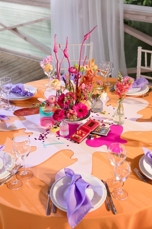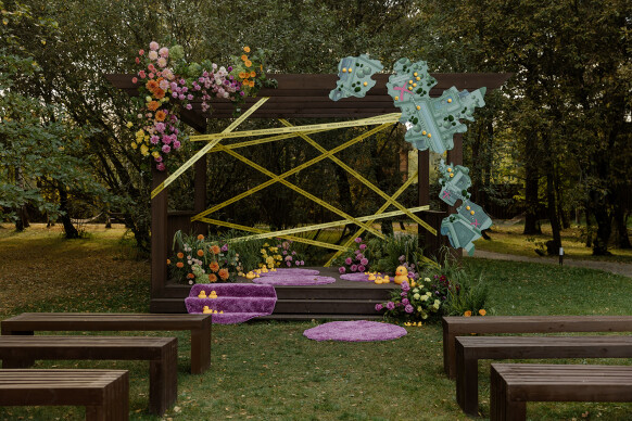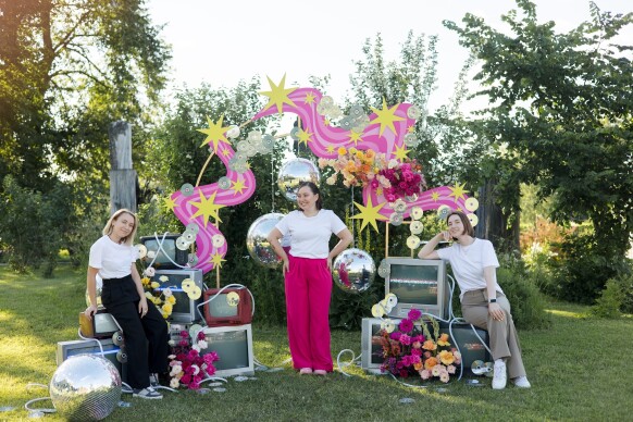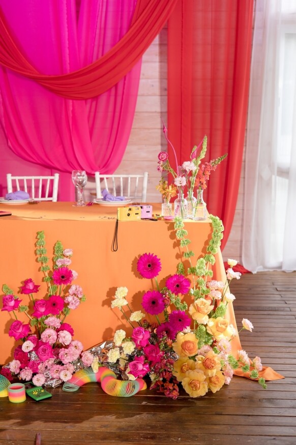 А в центре церемонии — работающие телевизоры, яркий пластик с культовыми семиконечными звёздами (как на фате невесты), компакт-диски, диско-шары и гибкий неон. Мерцающий, смелый, дерзкий дизайн, который не просто оформил праздник, а превратил его в портал в любимое десятилетие!