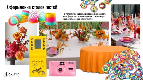 Этот день рождения стал настоящим путешествием в лихие 90-е! Мы с головой погрузились в атмосферу того времени, вдохновившись сериалом «Слово пацана». Вся Москва была нам в помощь: детали собирались по всем уголкам необъятной, чтобы м могли не просто преобразить пространство, а перенести гостей в мир их детства и юности.