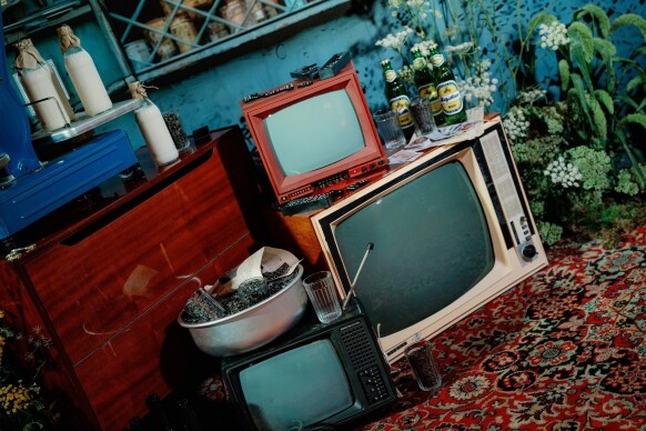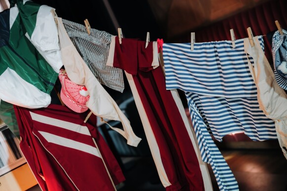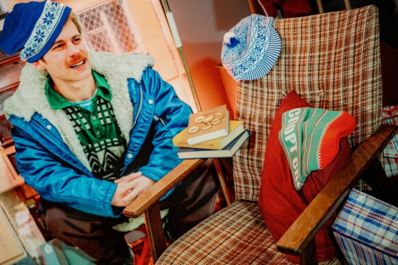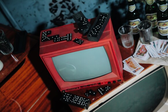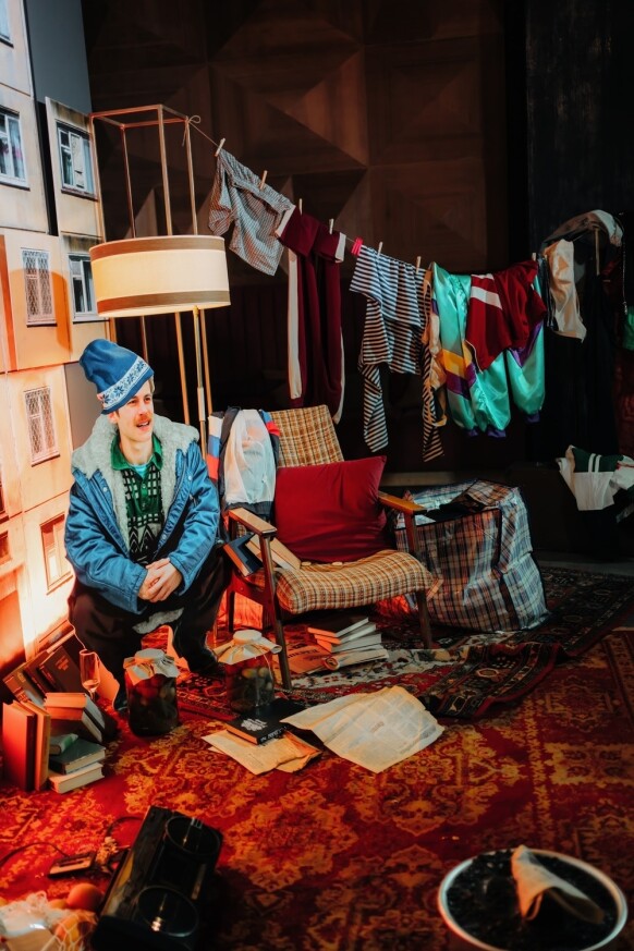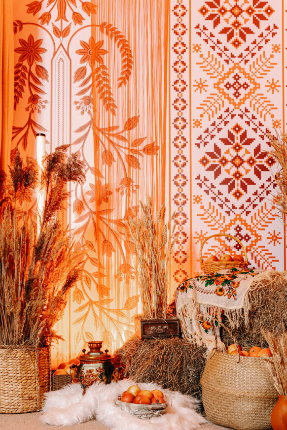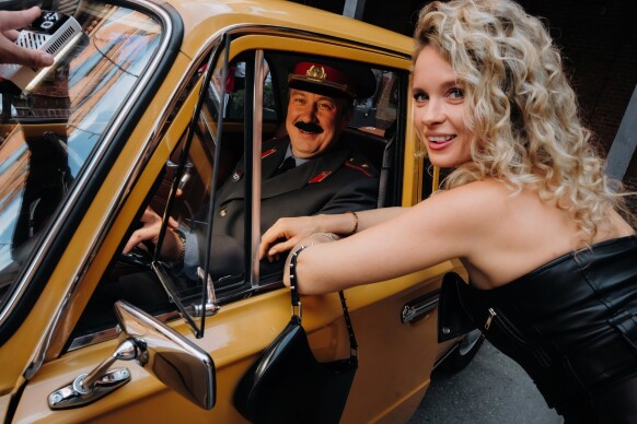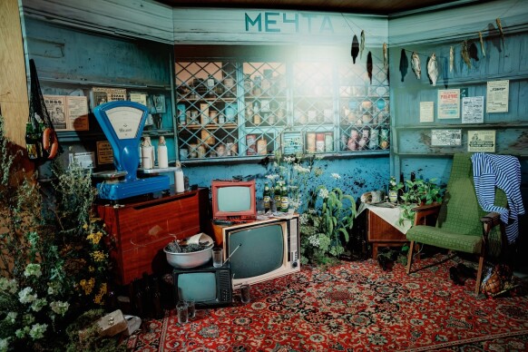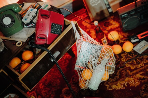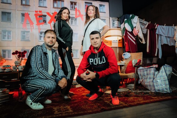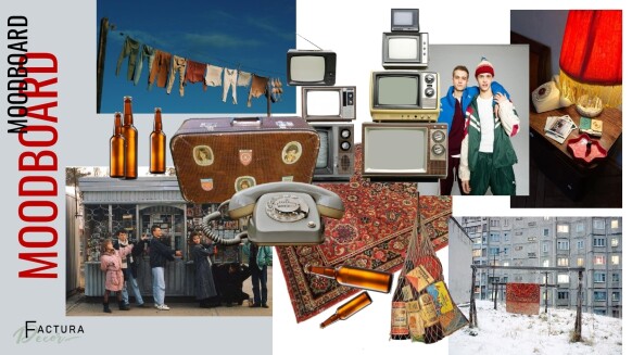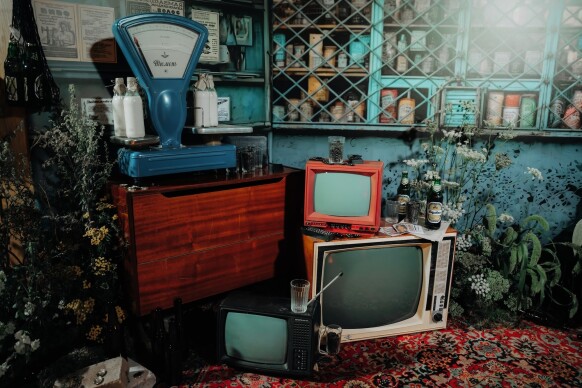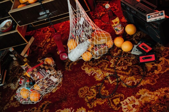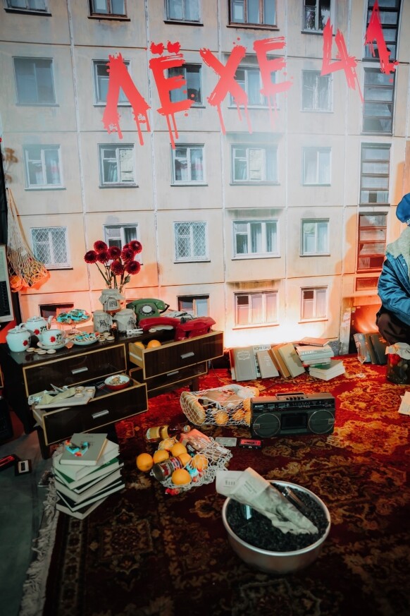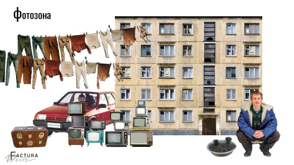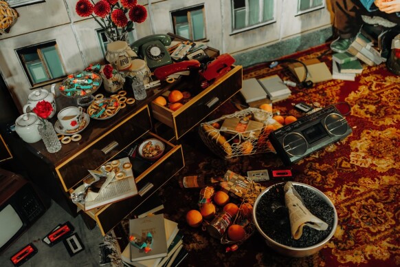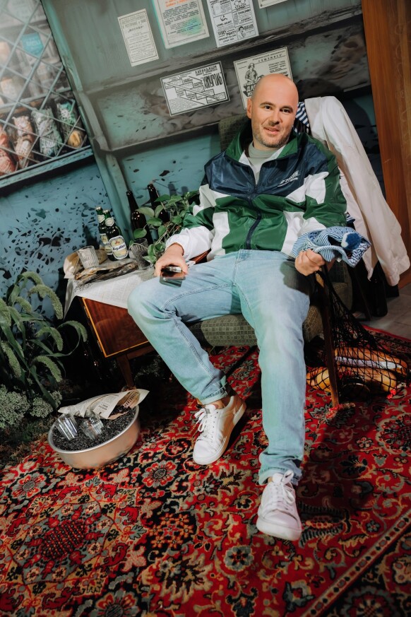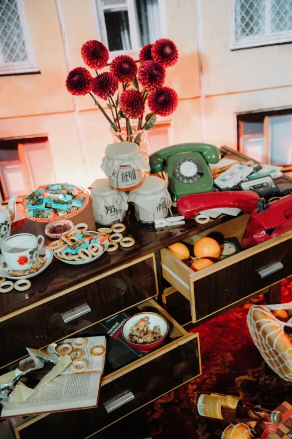 Вторая фотозона — настоящая советская пятиэтажка! Старинная мебель, ковры, магнитофоны, кассеты и, конечно, бабушкины солёные помидоры. Здесь каждый элемент был как часть воспоминаний — от авосек с молоком до ирисок. Бельевая верёвка с олимпийками, тельняшками и фернандельками, а центральным акцентом стал Вова Адидас, с которым каждый из гостей спешил сделать фотографии.