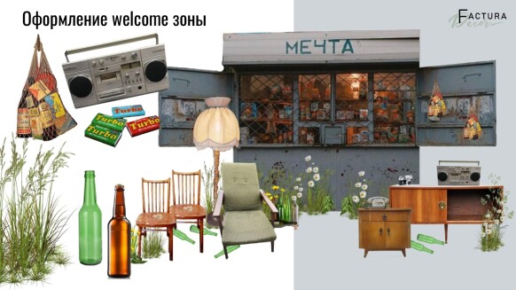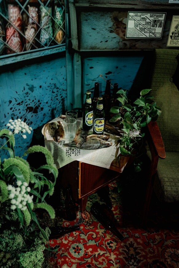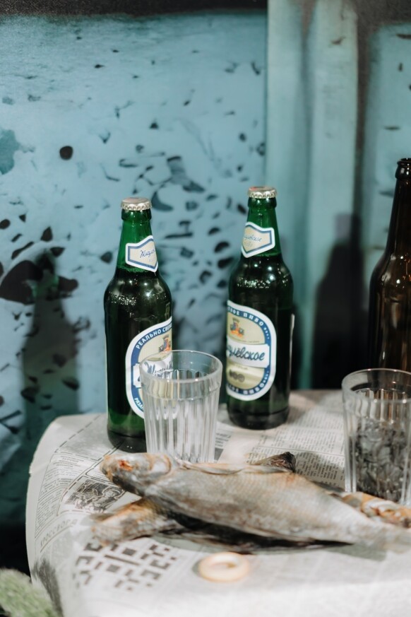 Декор в буквальном смысле оживил пространство! Фотозоны стали порталами в прошлое: ларёк, как с улицы— перенёс всех в двор 90-х. Весы с рынка, таз семечек, бутылки Жигулёвского, домино с игральными картами и аромат сушёной воблы! Она не только тематично выглядела, но и пахла, и конечно, стала самой яркой деталью.