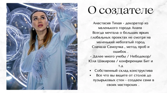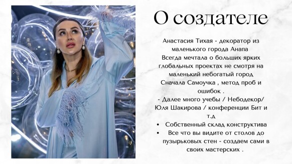 Илона Бильчук — декоратор из Москвы с опытом работы более 9 лет. С ней сотрудничали ACE EVENTS, MHoliday WEDDING, Special moments, VNV production, Togetherwedding, Первый канал и ТВЦ, Event- агентство EVENT MAISON. Имеет несколько наград.
