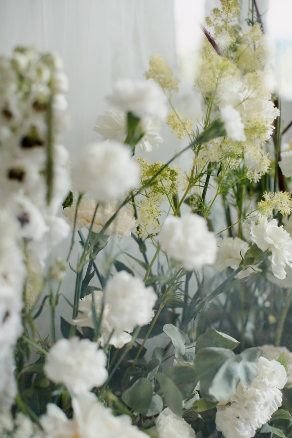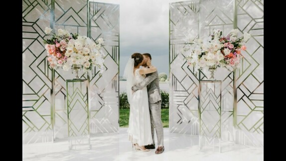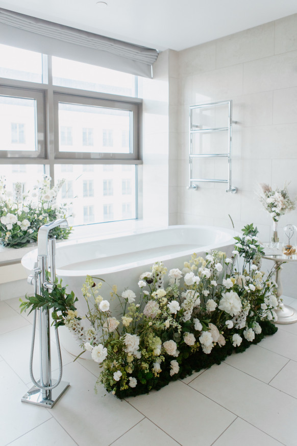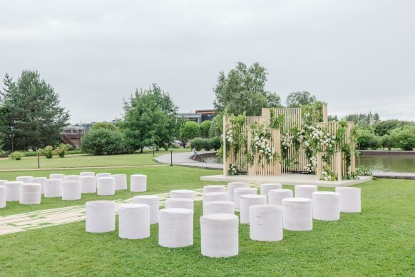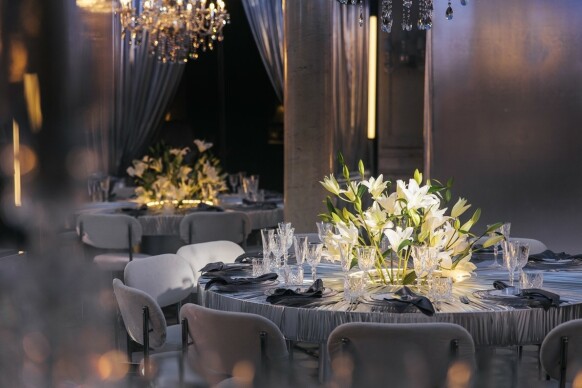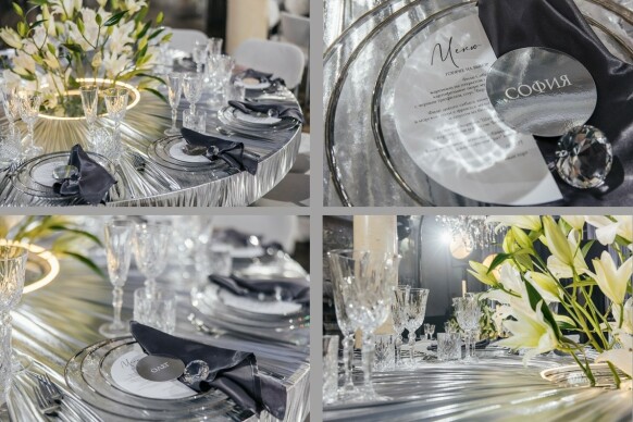 Столы с драпировкой из серебристой отражающей ткани, словно пропитаны светом и ощущением торжества. В центре каждого стола — ниша с прозрачной водой, в которой белые лилии, словно нежные фантазии, вздымаются из водной глади. Эта минималистская композиция являет собой дань азиатскому искусству икебаны, наполняя пространство элегантностью и спокойствием.