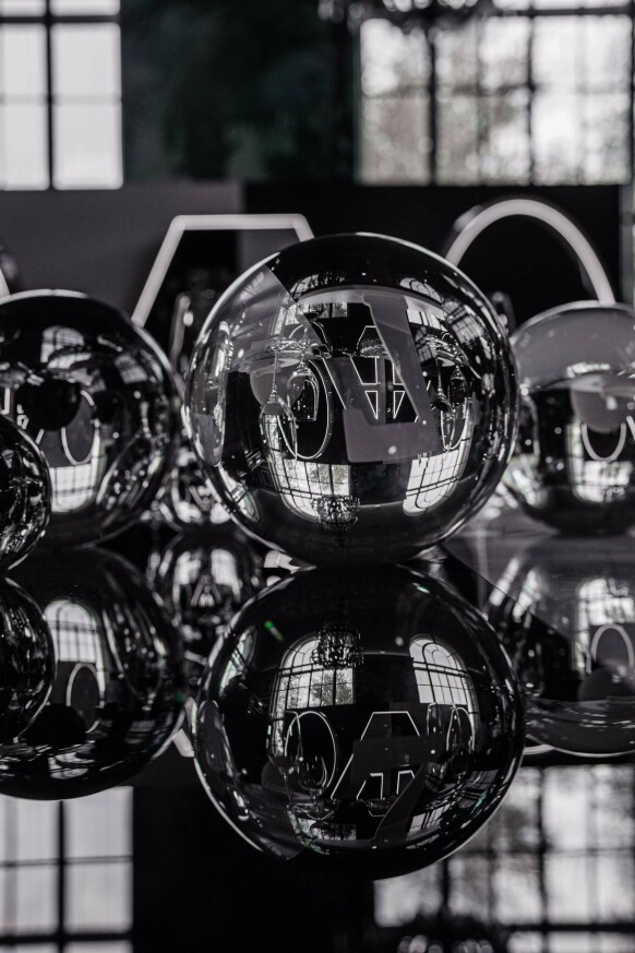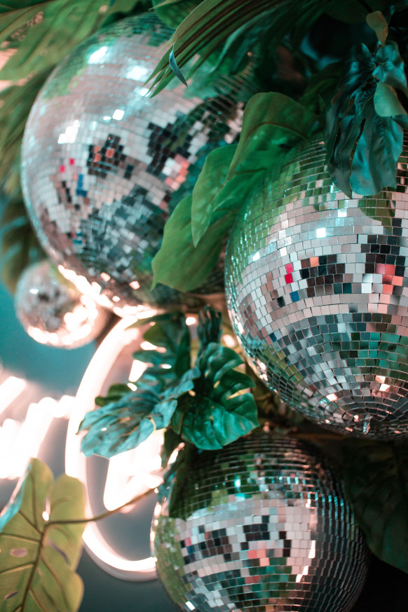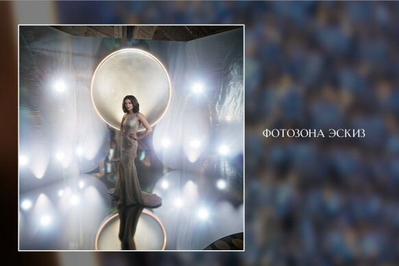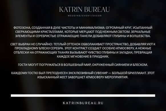 Фотозона, созданная в духе чистоты и минимализма: огромный круг, усыпанный сверкающими кристаллами, которые мерцают под нежным светом. Зеркальные элементы и серебристые отражающие панели добавляют глубины и волшебства.