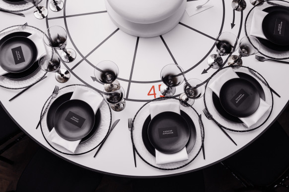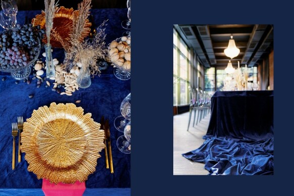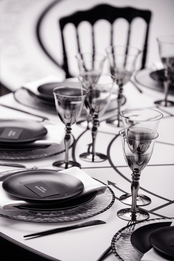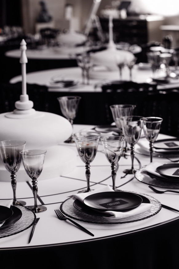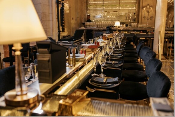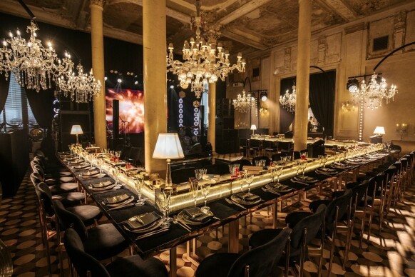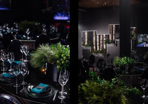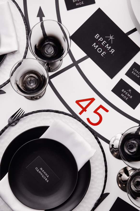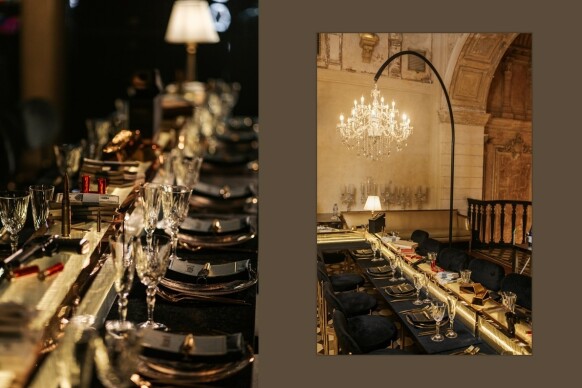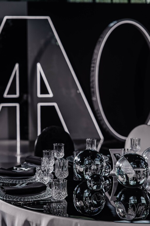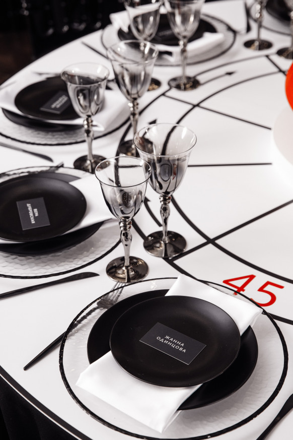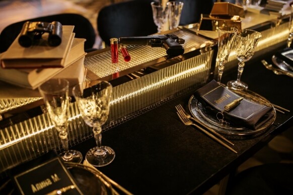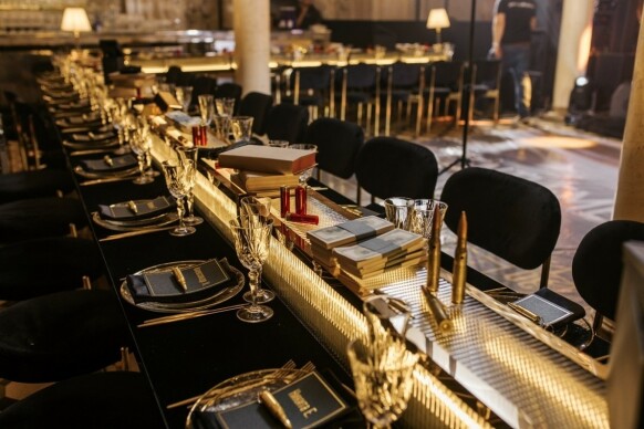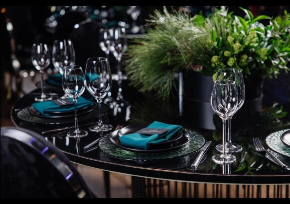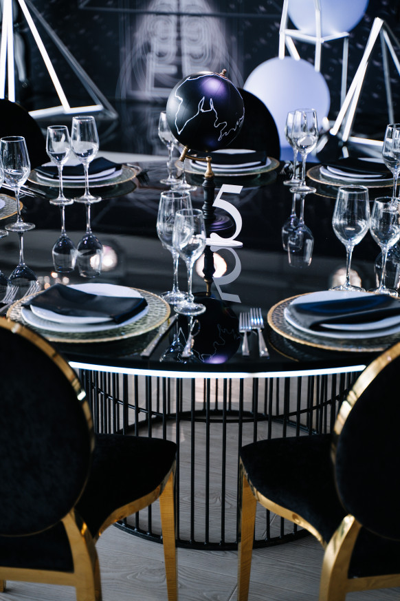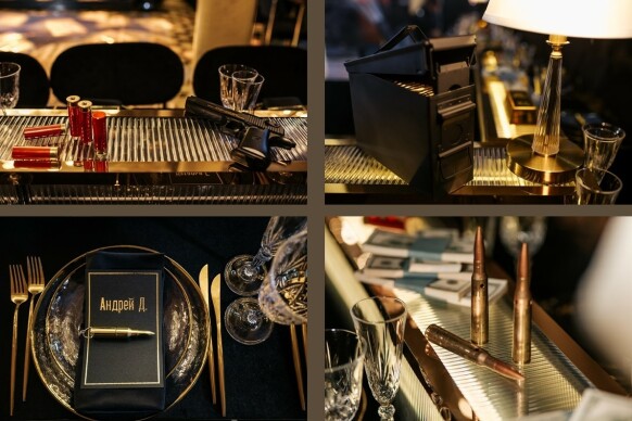 Стол, уставленный изысканными элементами, отражает строгость и аристократизм. Он становится центром объединения — длинный единый стол, символизирующий связь между всеми гостями, созвучный атмосфере "семейного" сбора мафии с легким налетом братства и тайны. Декор создавался индивидуально для этого мероприятия; каждая деталь наполнена элегантностью. Строгие линии и сдержанная цветовая гамма, преобладающая черным и золотом, несут в себе дух мужского праздника. Черный бархат стола, обрамленный хрустальной посудой, подчеркивает стиль и утонченность вечера.