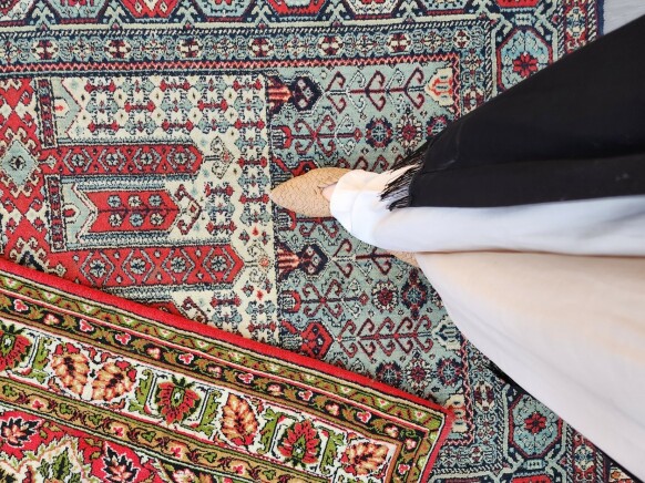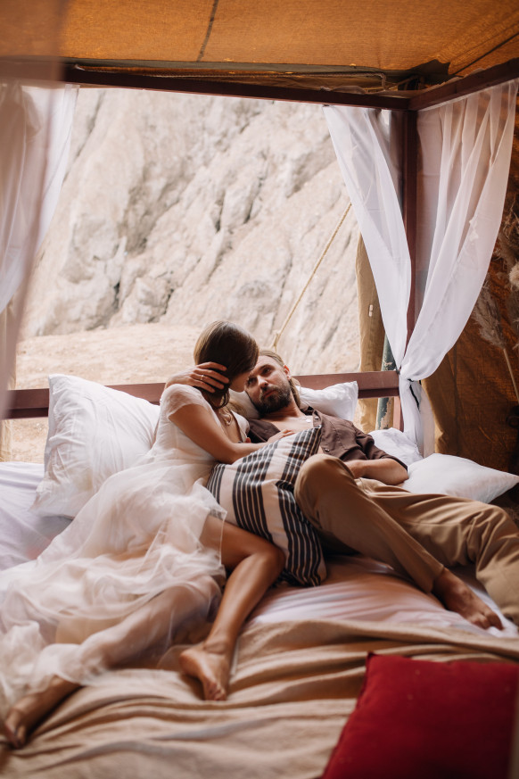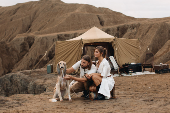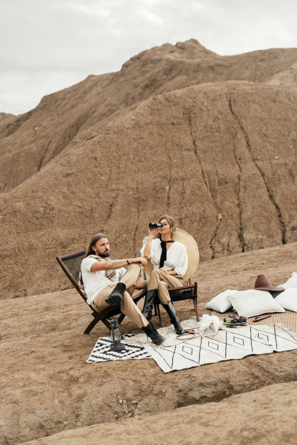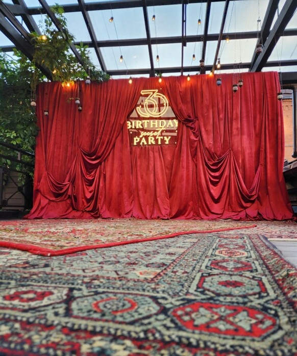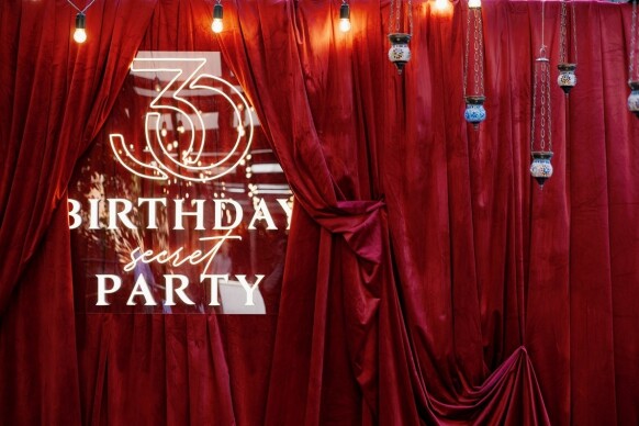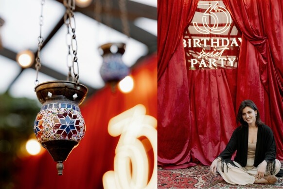 Фотозона продолжает восточную тематику — красные бархатные занавесы, словно охватывающие гостей, обрамлены изысканными цветными фонариками. Яркие узоры ковров, раскинувшиеся под ногами, приглашают гостей в мир восточного шарма.
