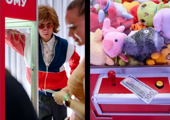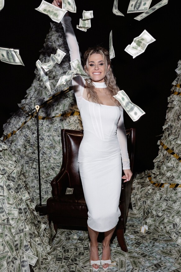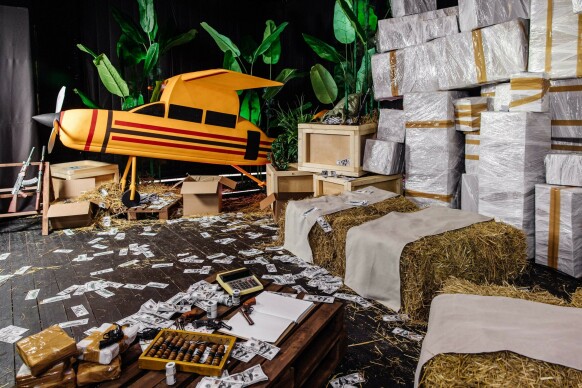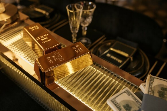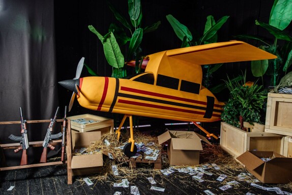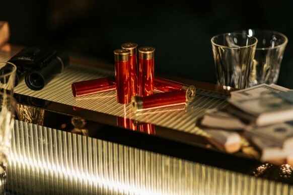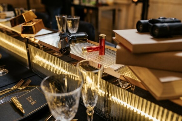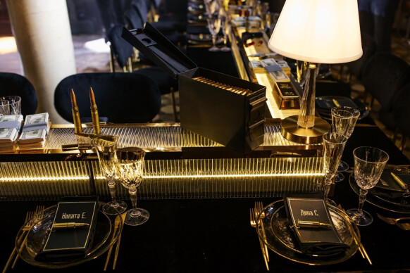 С учетом ограниченного пространства площадки и большого количества гостей, перед нами была интересная задача – не только продумать схему рассадки, но и сохранить декор на столах. Мы создали уникальные светильники-подиумы, их граненая форма напоминала хрустальные кристаллы, добавляя визуальную игру и глубину (также поддерживая концепцию площадки, так как хрусталь такой формы присутствует в интерьере). На них мы разместили элементы криминальной эстетики: гильзы, патроны, горы "долларов« и золотых слитков.