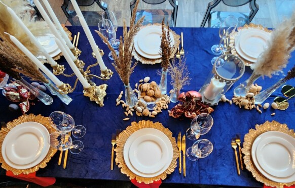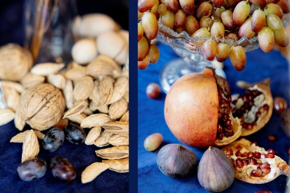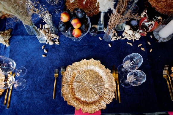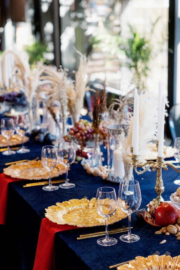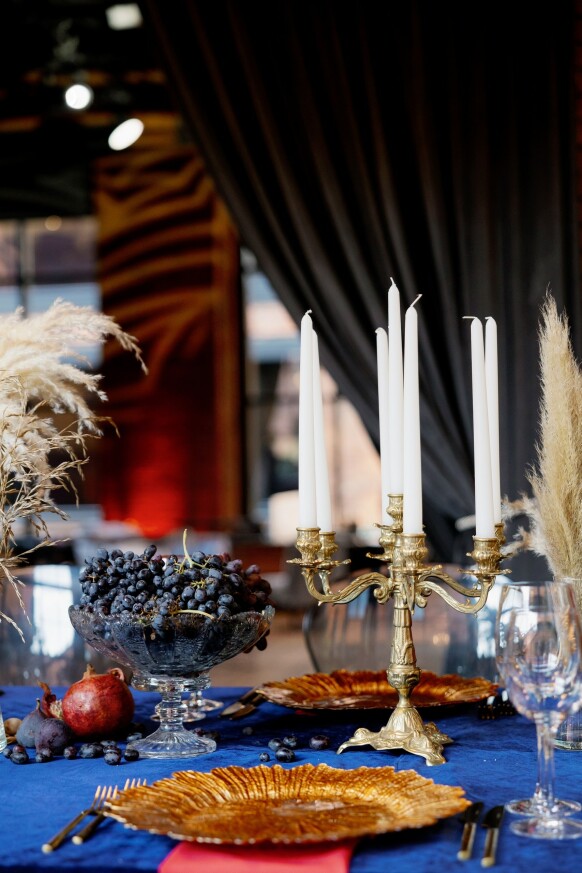 Длинный стол, изобильно усыпанный свежими фруктами, орехами и ягодами, в традициях восточного гостеприимства, пленит взгляд и пробуждает аппетит. Яркие цвета сочных угощений укореняются в вазах, а длинный бархатный шлейф скатерти придает особую атмосферу роскоши и торжественности восточных вечеров. Золотые резные антикварные подсвечники и фактурные тарелки в сервировке придают мероприятию нотку королевского благородства.