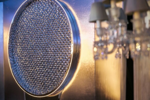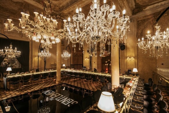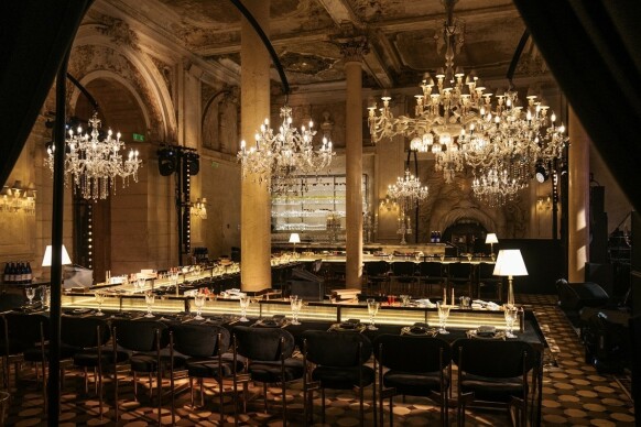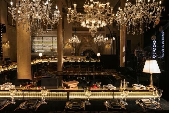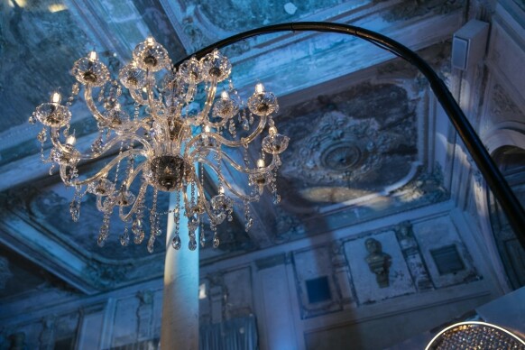 В декоре задействовано много дополнительной подсветки, которая задавала настроение и подчеркивала ощущение секретности. Хрустальные люстры на стойках дополняли интерьер зала и обилие хрусталя в нем.