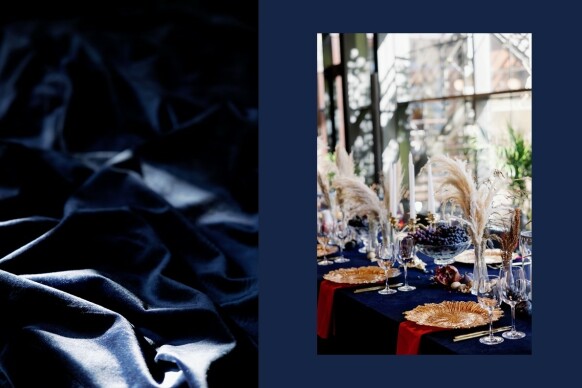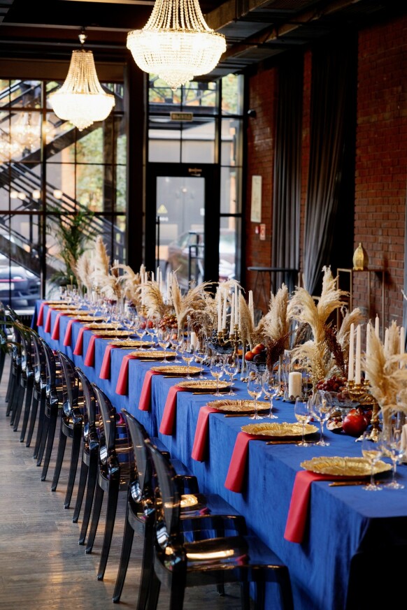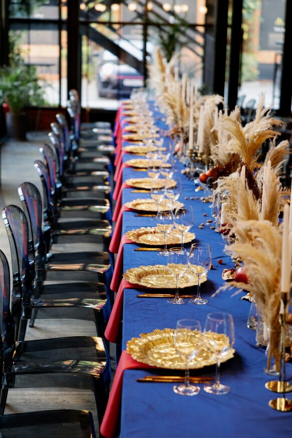 Зона банкета, где переплетаются восточное великолепие и утонченная элегантность. Сочные оттенки чернильного и кораллового-красных цветов гармонично сочетаются с изысканными золотыми акцентами, создавая завораживающую томную палитру. Пушистые сухоцветы – напоминают перышки, часто использующиеся в данной стилистике.