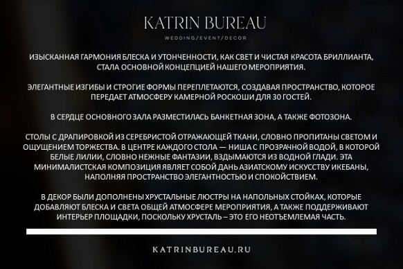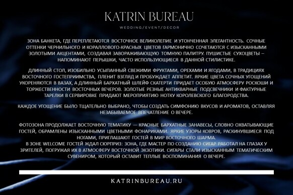 Студия декора Katrin Bureau. Создаем стильный креативный декор масштабных мероприятий, частных событий и сезонный декор любых пространств (а также фасадов, витрин и т.д.). Коротко о студии: ● 9 лет в сфере декора ● Благодаря своему производству работаем быстро и качественно, даже если нужно «вчера» ●Предвосхищаем ожидания клиентов и делаем счастливыми организаторов ●Делаем так, чтобы проект всегда выглядел масштабно и портфолийно ●Находимся в Москве, но создаем для вас оформления в любой точке мира! "Декор с вашим характером". Стремимся всегда уловить индивидуальность наших заказчиков и отразить это в декоре.