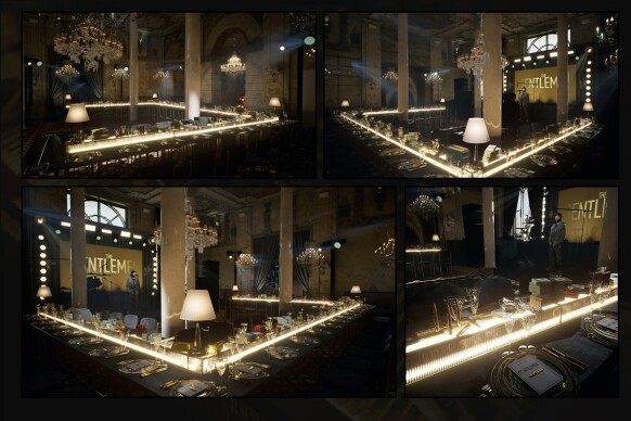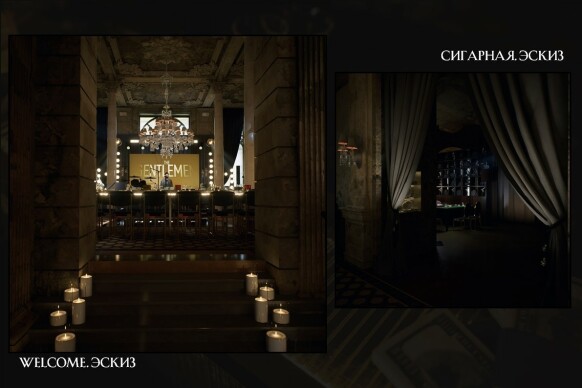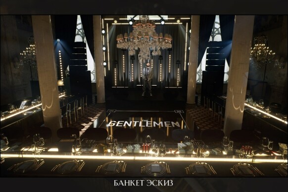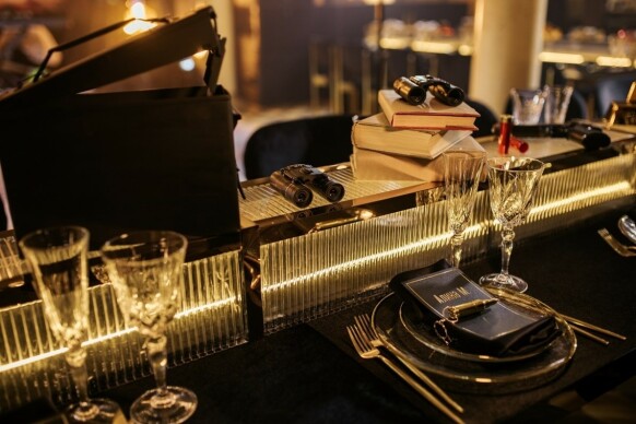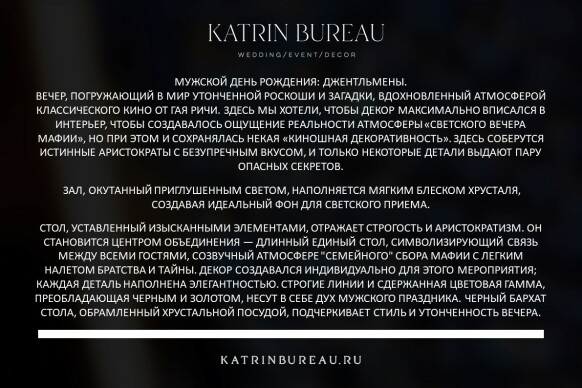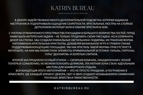 Вечер, погружающий в мир утонченной роскоши и загадки, вдохновленный атмосферой классического кино от гая ричи. Здесь мы хотели, чтобы декор максимально вписался в интерьер, чтобы создавалось ощущение реальности атмосферы «светского вечера мафии», но при этом и сохранялась некая «киношная декоративность». Здесь соберутся истинные аристократы c безупречным вкусом, и только некоторые детали выдают пару опасных секретов.