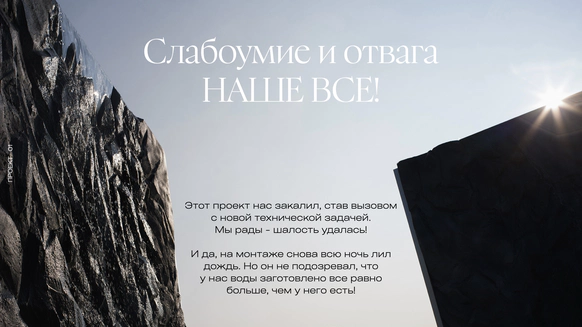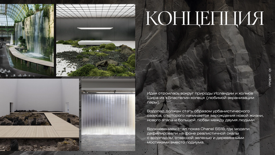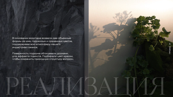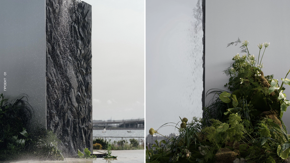 Водопад должен стать образом урбанистического оазиса, с которого начинается зарождения новой жизни, нового этапа и большой любви между двумя людьми.