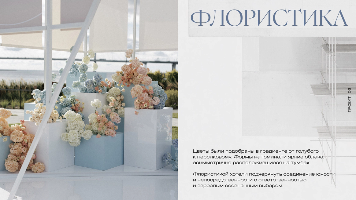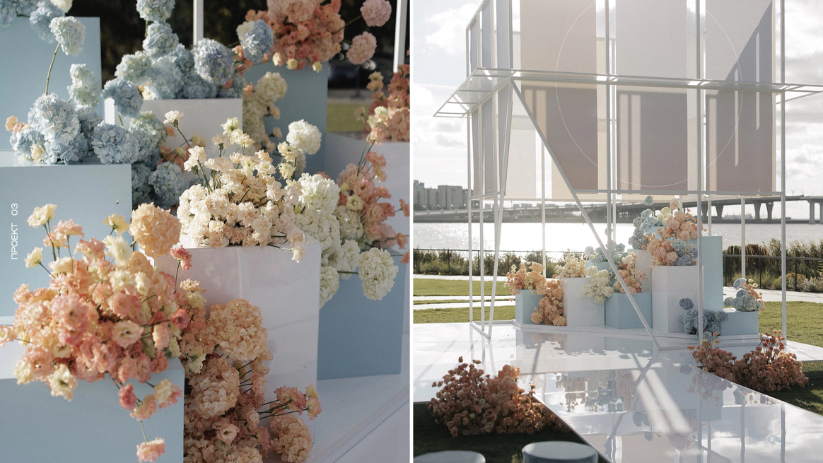 Два любимых оттенка пары: голубой и персиковый, мы соединили в один градиент цвета неба при закате.