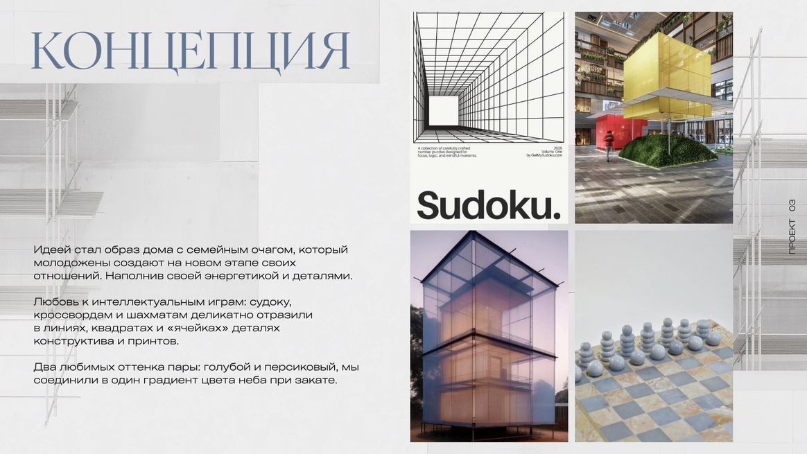 Любовь к интеллектуальным играм: судоку, кроссвордам и шахматам деликатно отразили в линиях, квадратах и «ячейках» деталях конструктива и принтов.