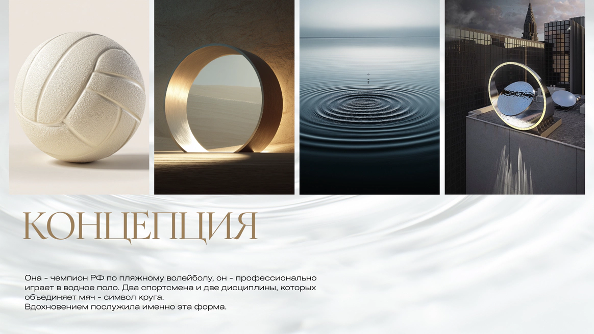 Она - чемпион РФ по пляжному волейболу, он - профессионально играет в водное поло. Два спортсмена и две дисциплины, которых объединяет мяч - символ круга. Вдохновением послужила именно эта форма.