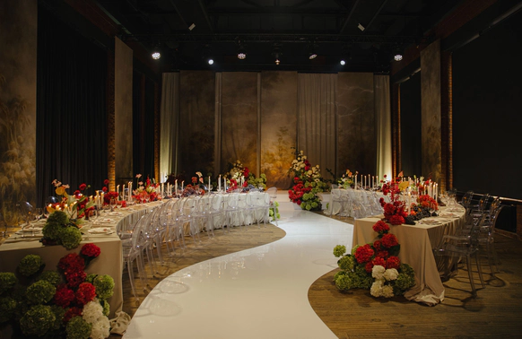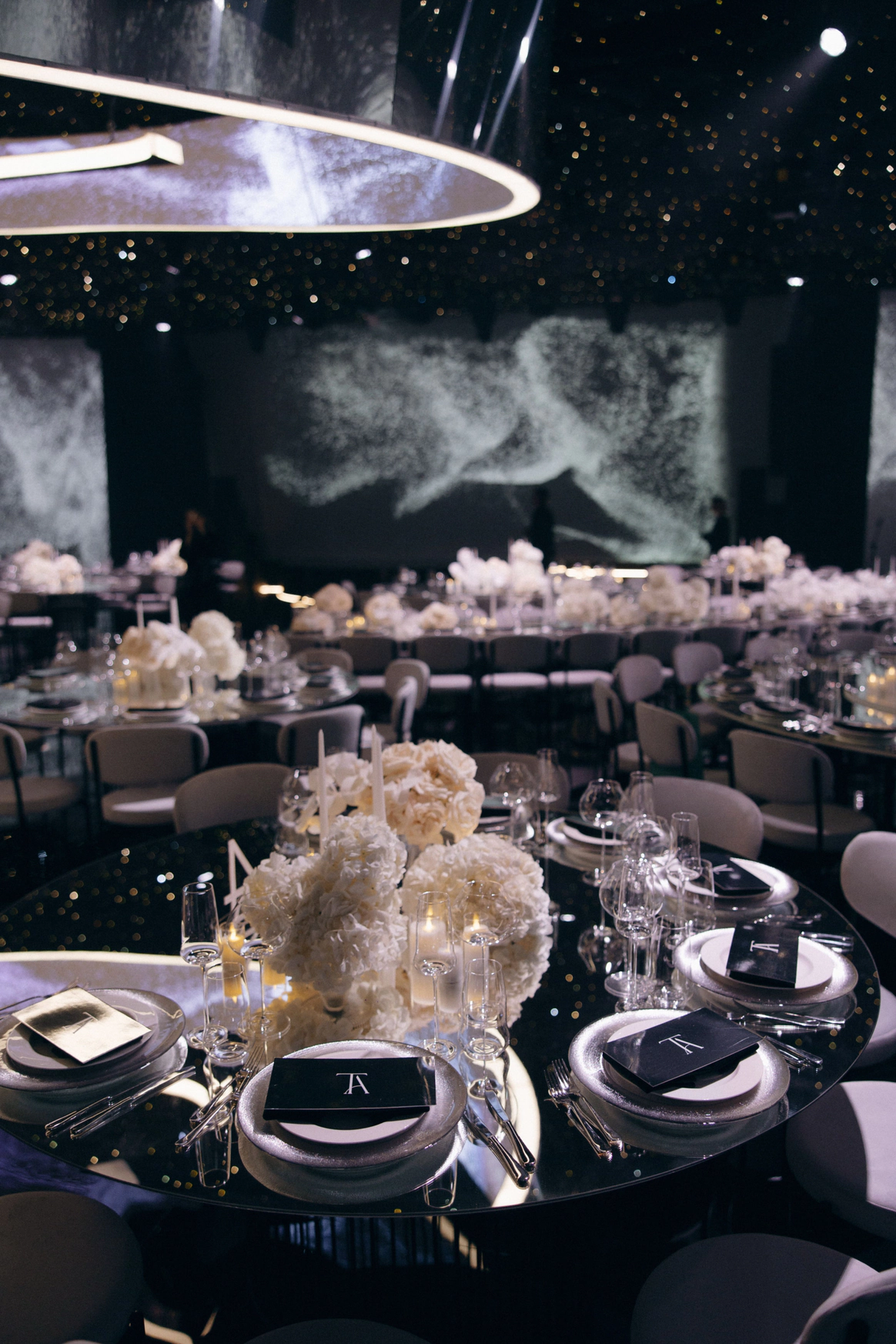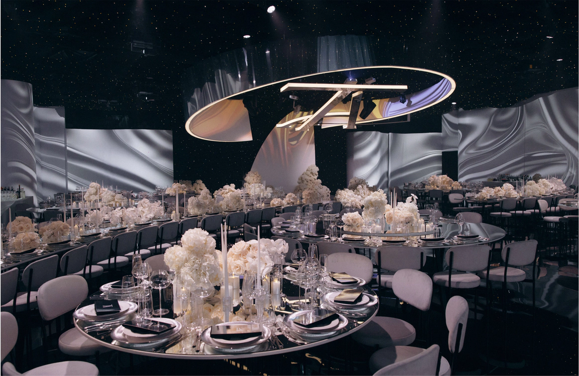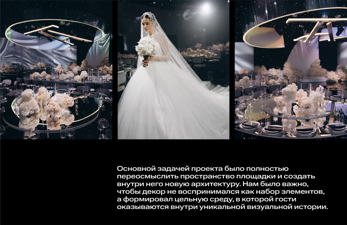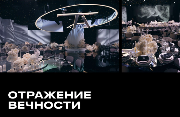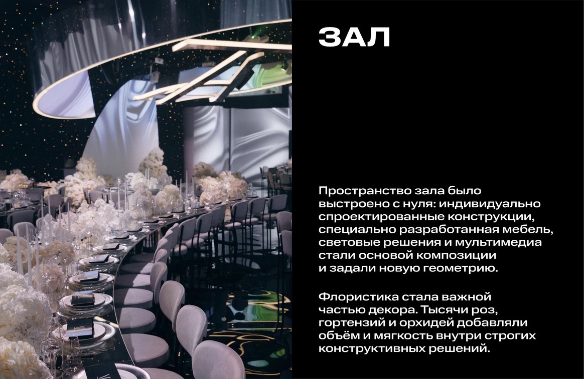 Пространство зала было выстроено с нуля: индивидуально спроектированные конструкции, специально разработанная мебель, световые решения и мультимедиа стали основой композиции и задали новую геометрию. Флористика стала важной частью декора. Тысячи роз, гортензий и орхидей добавляли объём и мягкость внутри строгих конструктивных решений.