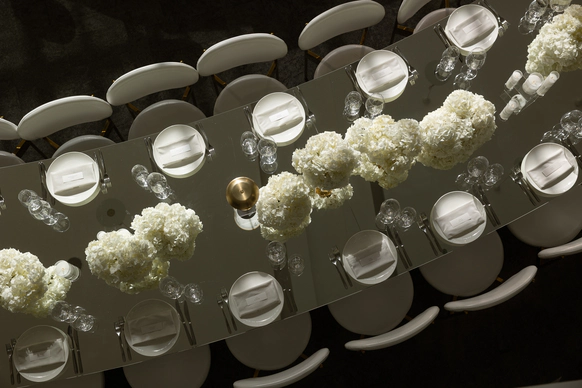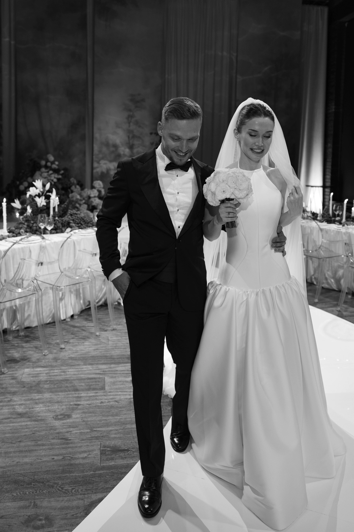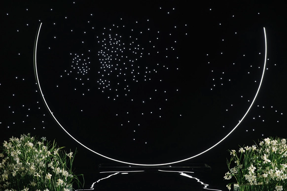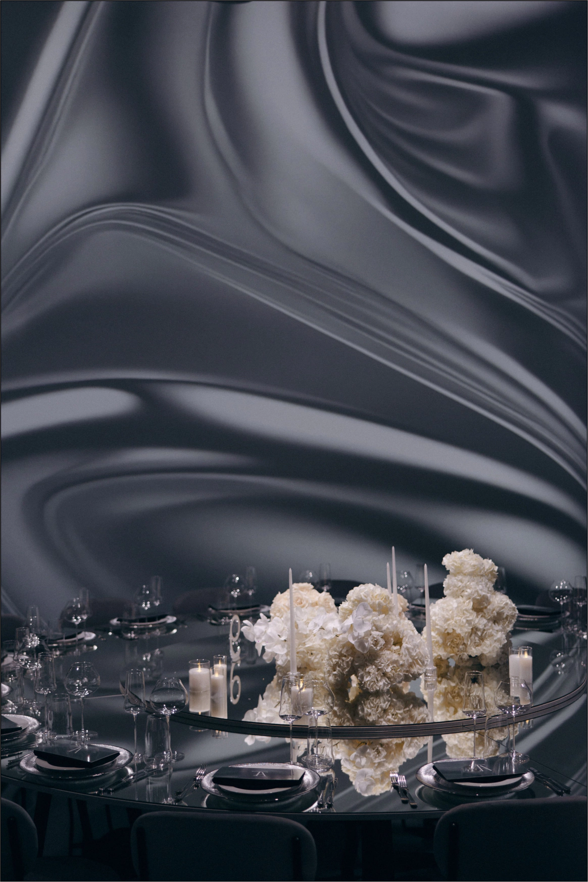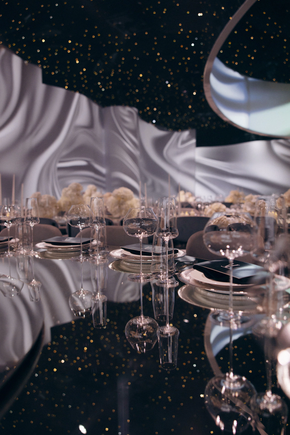 Пространство зала было выстроено с нуля: индивидуально спроектированные конструкции, специально разработанная мебель, световые решения и мультимедиа стали основой композиции и задали новую геометрию. Флористика стала важной частью декора. Тысячи роз, гортензий и орхидей добавляли объём и мягкость внутри строгих конструктивных решений.