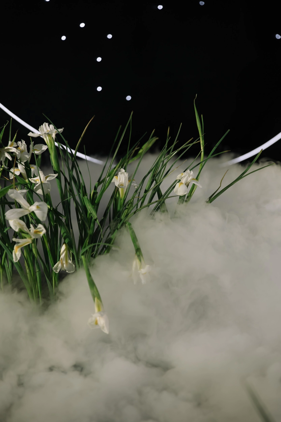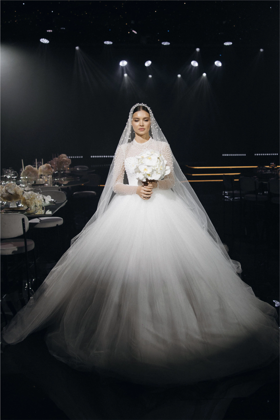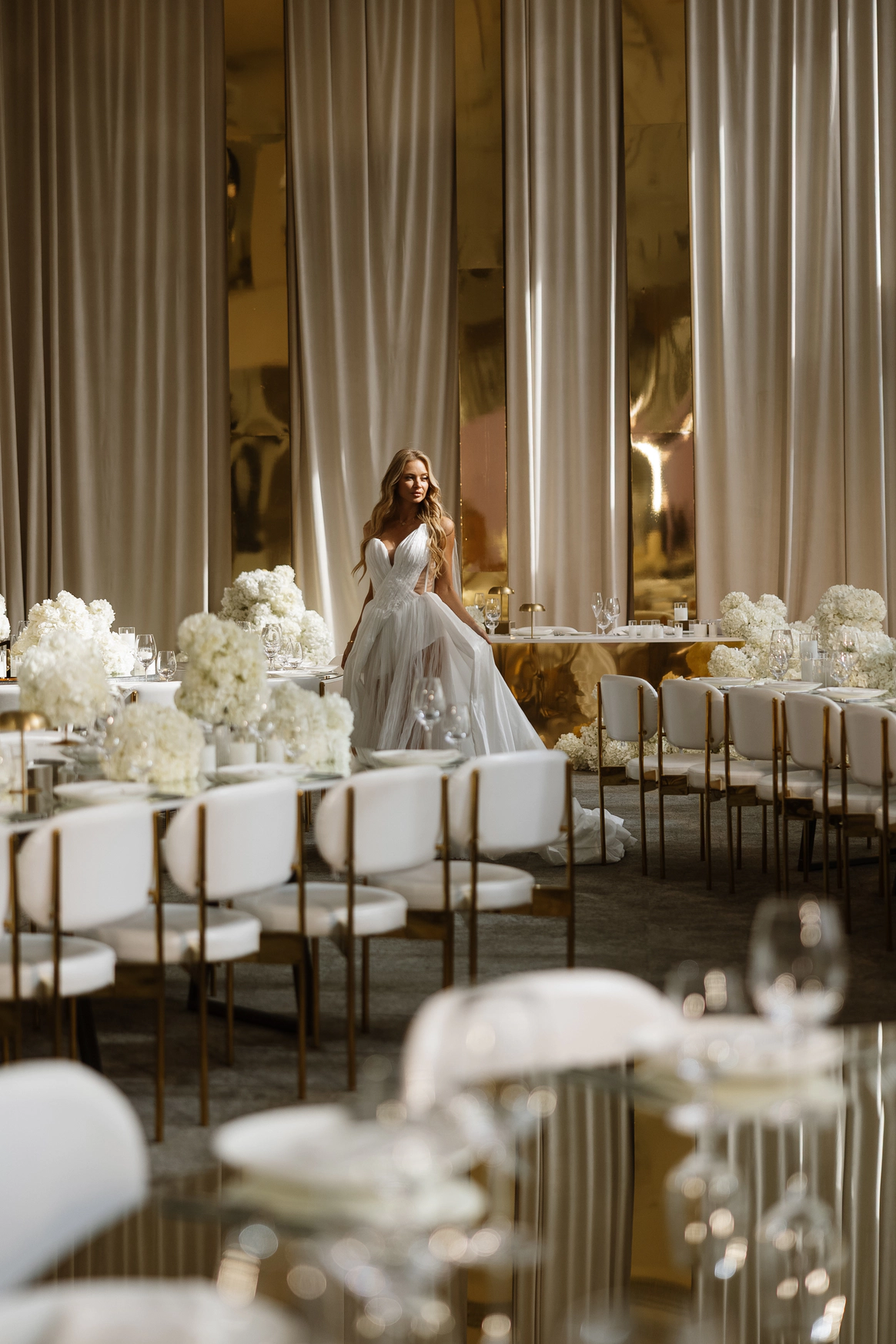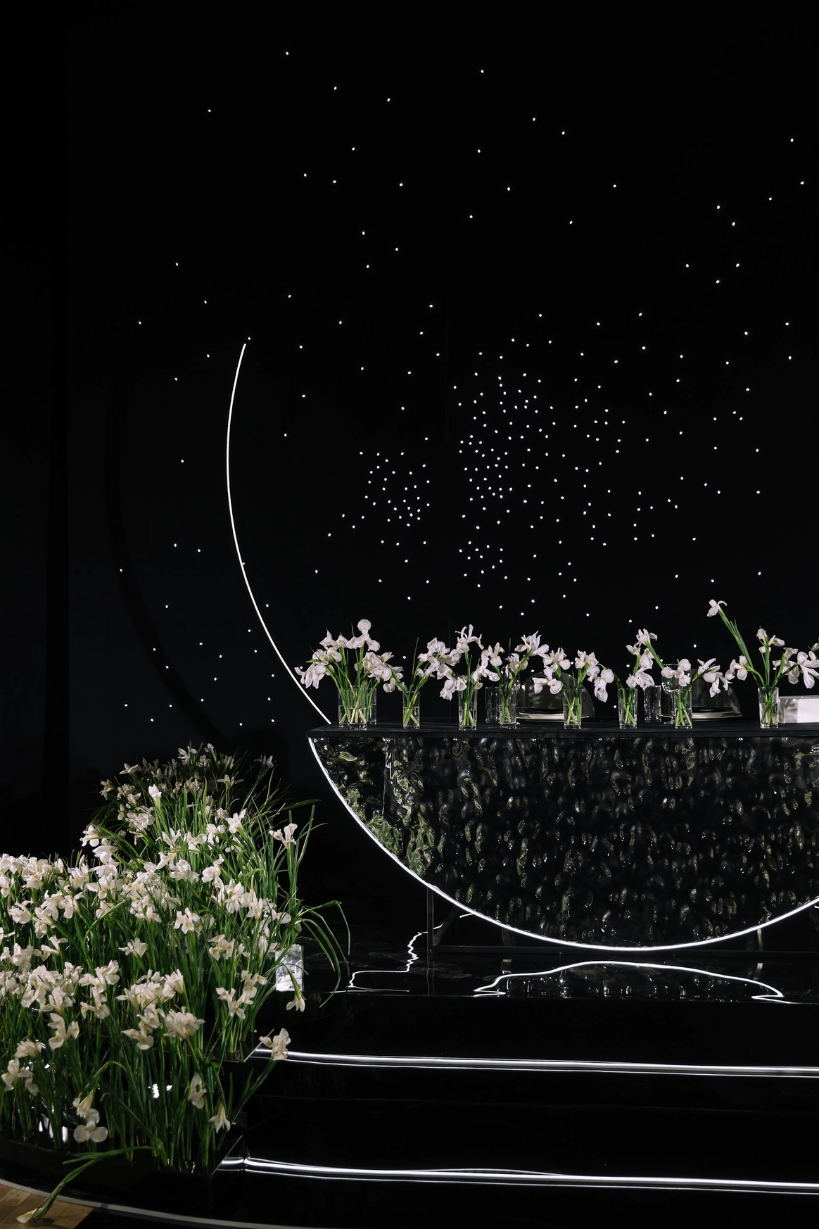 Пространство зала было выстроено с нуля: индивидуально спроектированные конструкции, специально разработанная мебель, световые решения и мультимедиа стали основой композиции и задали новую геометрию. Флористика стала важной частью декора. Тысячи роз, гортензий и орхидей добавляли объём и мягкость внутри строгих конструктивных решений.
