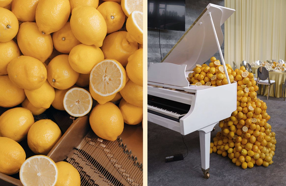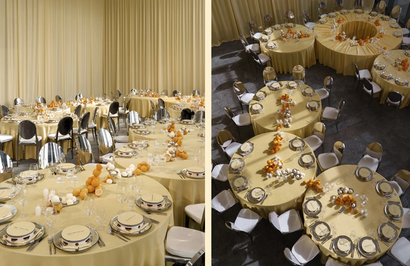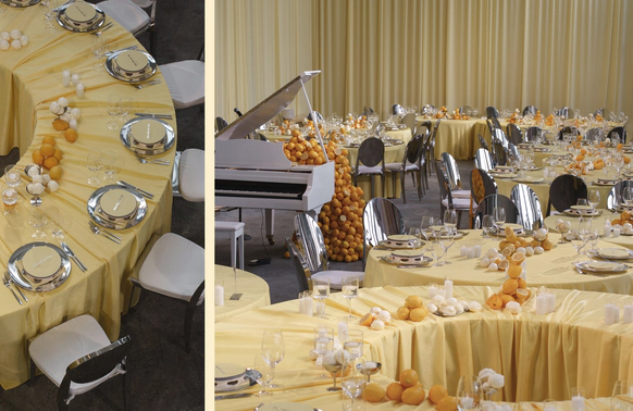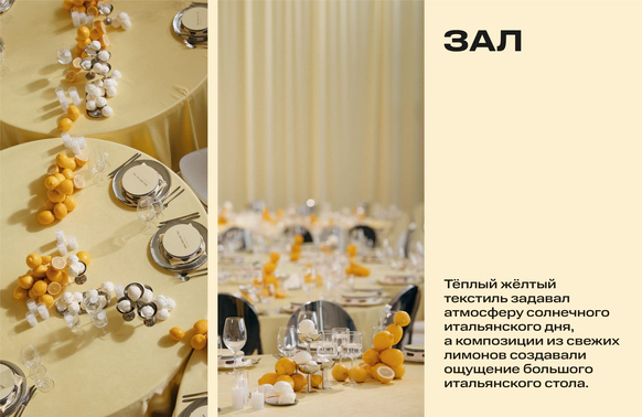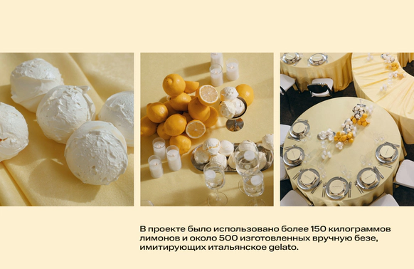 Тёплый жёлтый текстиль задавал атмосферу солнечного итальянского дня, а композиции из свежих лимонов создавали ощущение большого итальянского стола. В проекте было использовано более 150 килограммов лимонов и около 500 изготовленных вручную безе, имитирующих итальянское gelato, размещённых в металлических креманках и на столах.