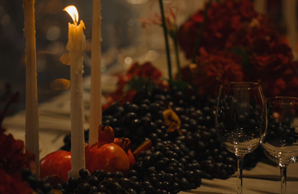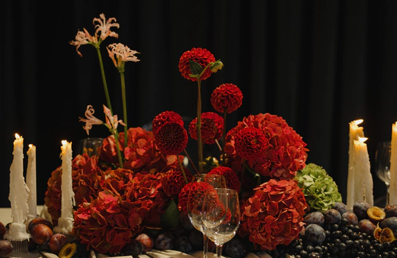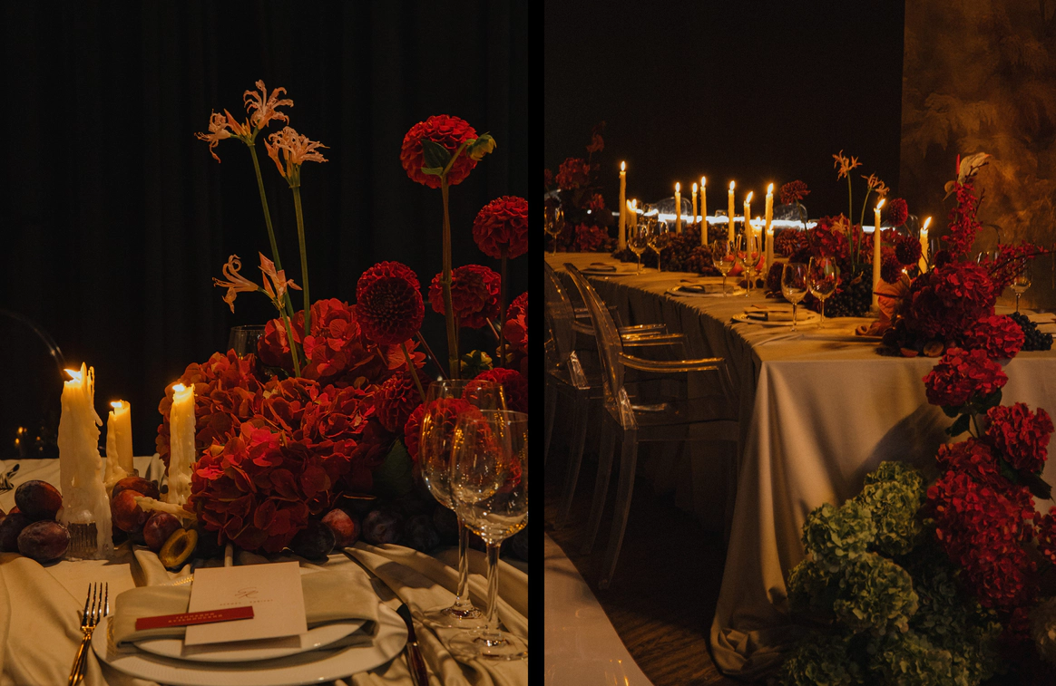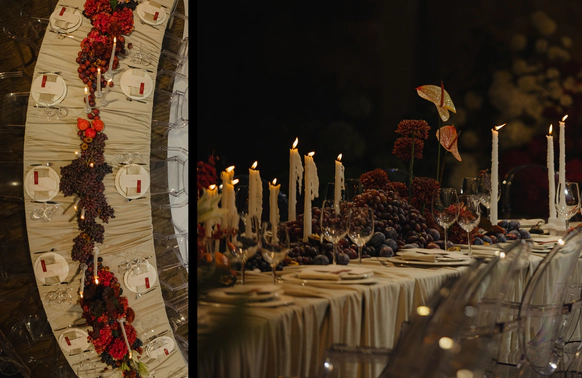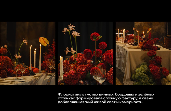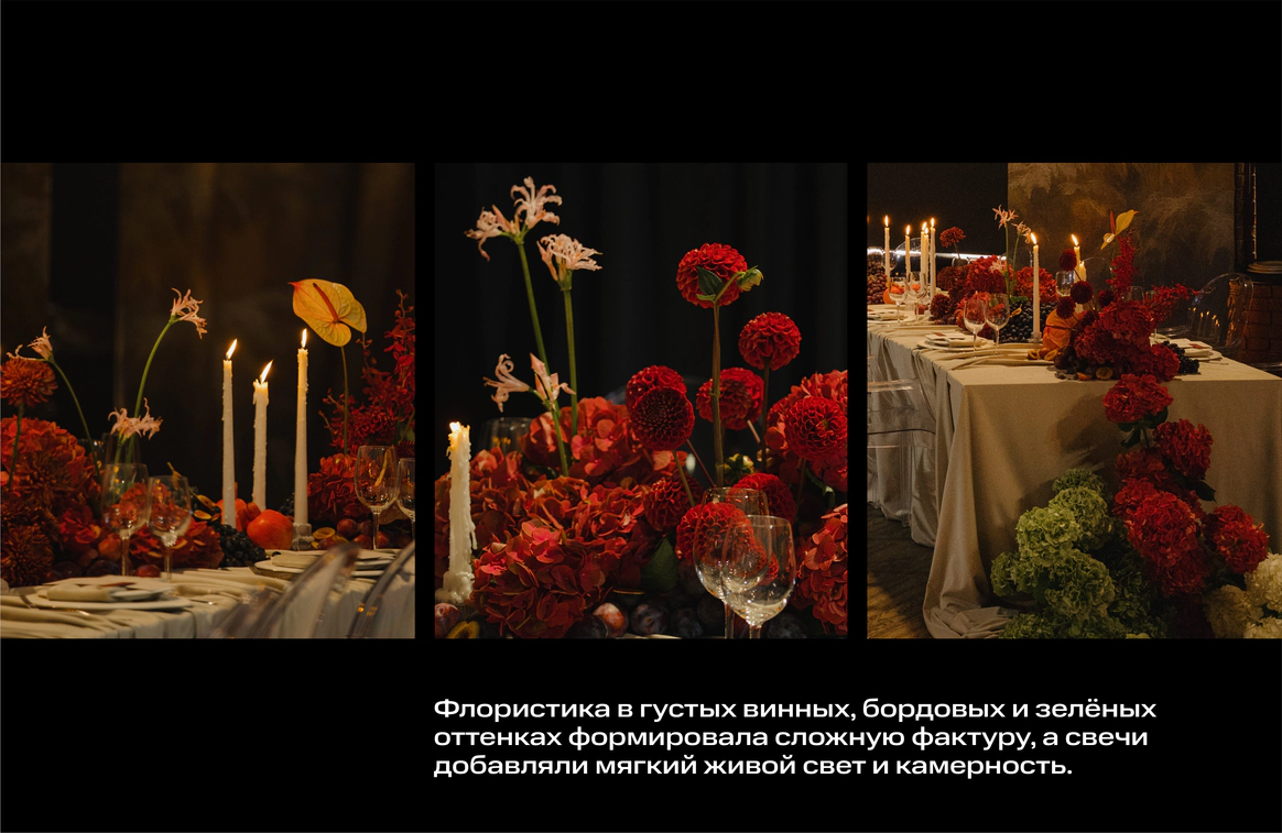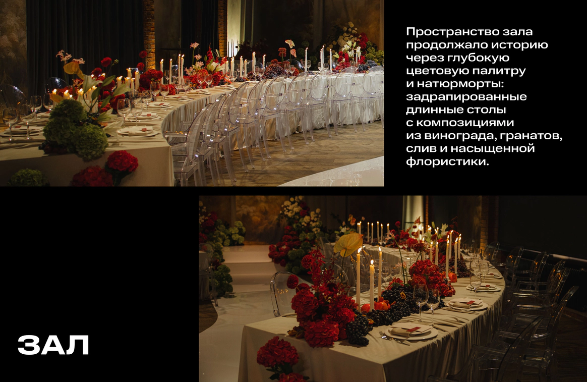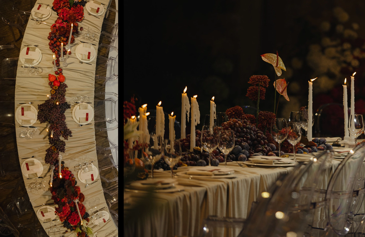 Пространство зала продолжало эту историю через глубокую цветовую палитру и натюрморты: длинные столы, задрапированные мягкими тканями, с композициями из винограда, гранатов, слив и насыщенной флористики. Флористика в густых винных, бордовых и зелёных оттенках формировала сложную фактуру, а свечи добавляли мягкий живой свет и камерность.