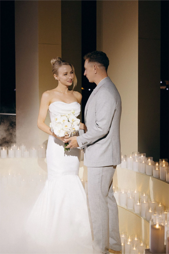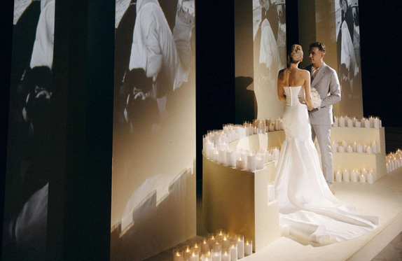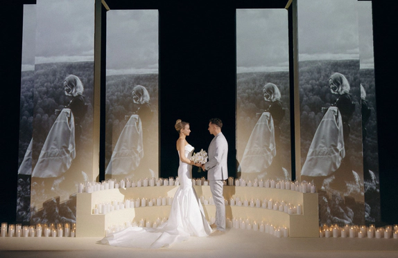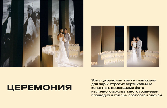 Зона церемонии, как личная сцена для пары: строгие вертикальные колонны с проекциями фото из личного архива, многоуровневая площадка и тёплый свет сотен свечей.