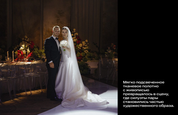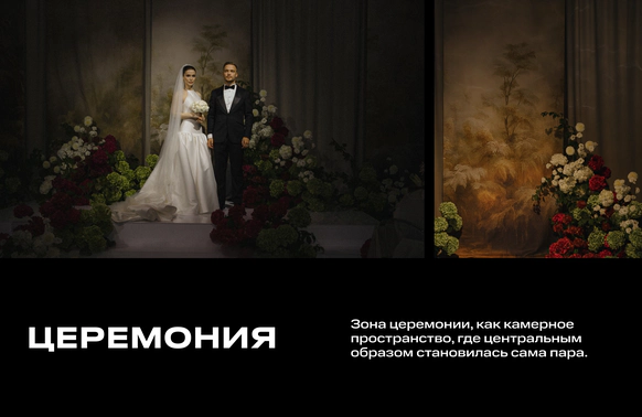 Зона церемонии, как камерное пространство, где центральным образом становилась сама пара. Мягко подсвеченное тканевое полотно с живописью превращалось в сцену, где силуэты пары становились частью художественного образа.